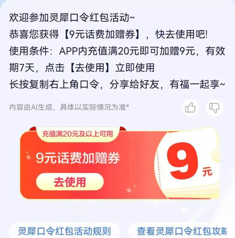 重点提示:单人单设备限领一次(数量有限,先到先得)。每个的优惠券不相同,小编两个号,一个中7,另一个中9元话费券