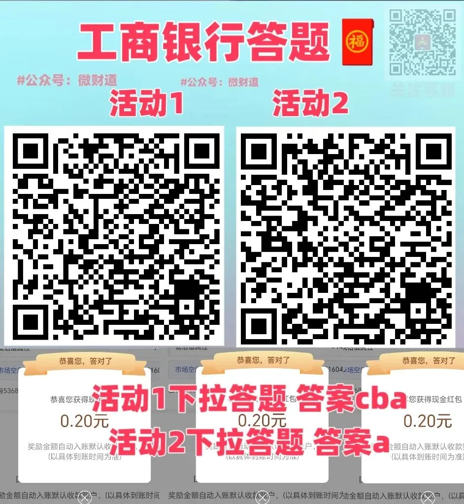 参与方法:手机微信扫描截图上二维码跳转到“中国工商银行”APP活动里,下拉页面依次点击3个答题进去,每个答题可以领到0.2元现金红包,活动1答案依次为:C,B,A。活动2答案为:A