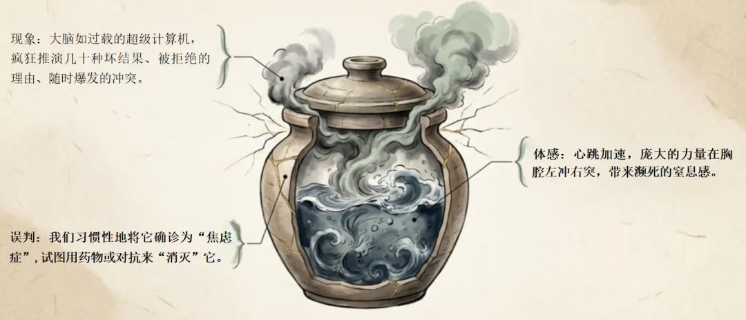 深夜里,你躺在床上,心跳加速,大脑像一台过载的超级计算机,疯狂推演着明天那个项目的几十种坏结果、客户可能拒绝的理由、或者是某段关系中随时可能爆发的冲突。你尝试去冥想、去深呼吸,但那股力量太庞大了,它在你的胸腔里左冲右突,让你感到一种濒死的窒息感与深深的自我内耗。