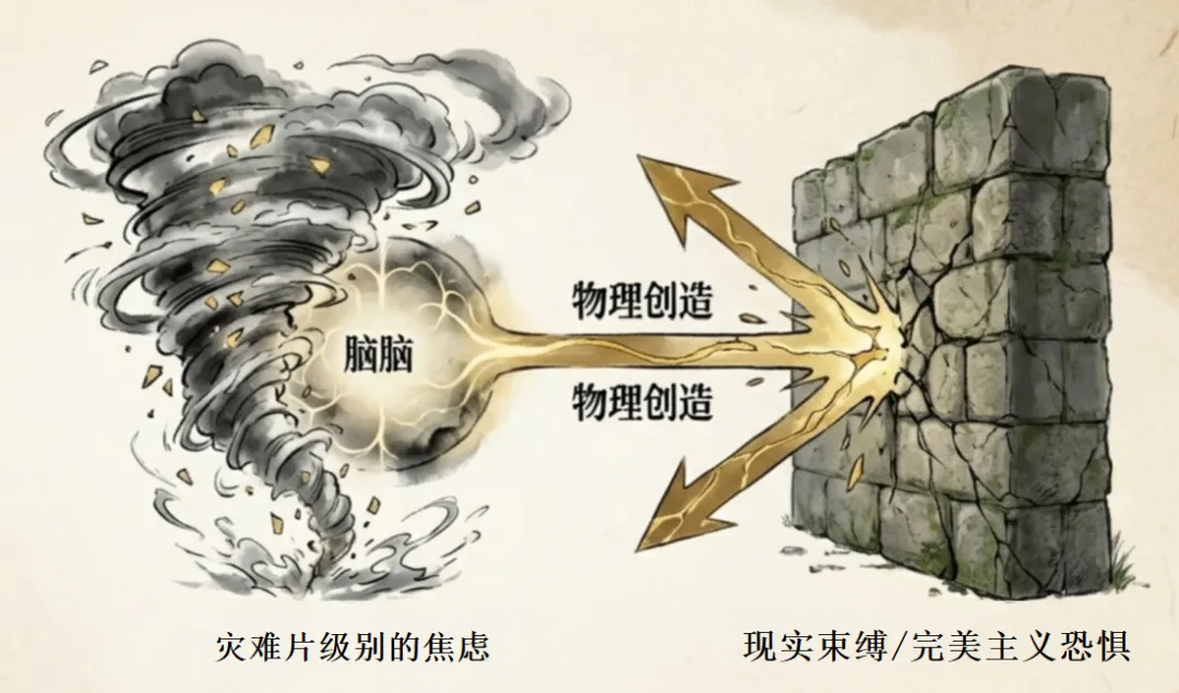 它被困在了你的大脑皮层里。既然你不允许它在现实三维世界中去构建美好的事物,它就会在你的脑海中去构建最宏大的灾难片。你的焦虑有多深,你在平行时空里的创造力就有多强。