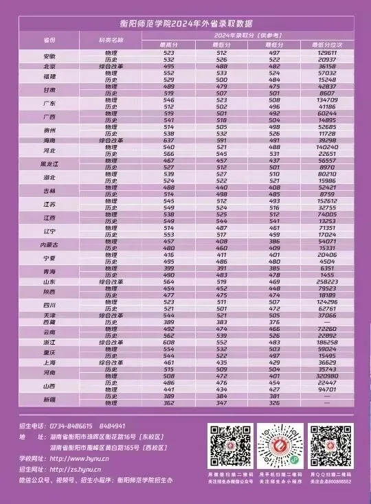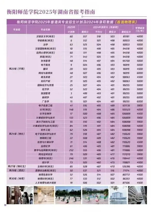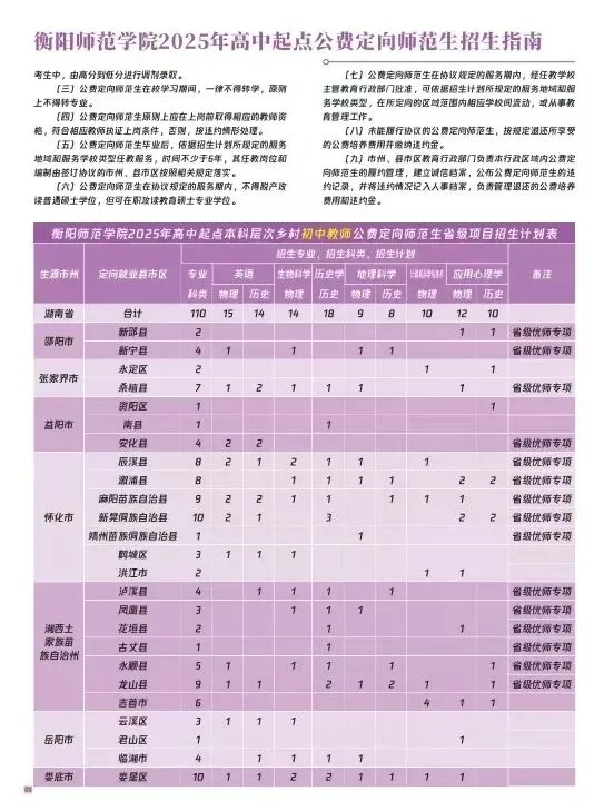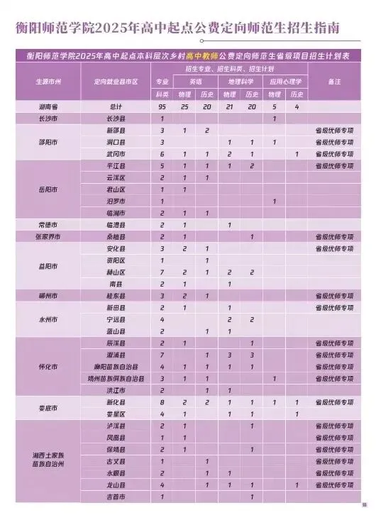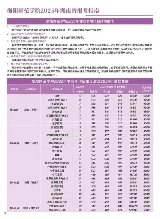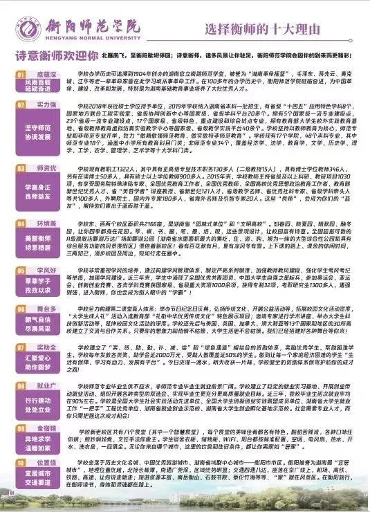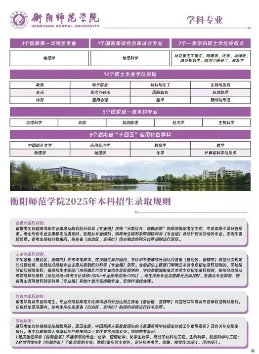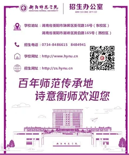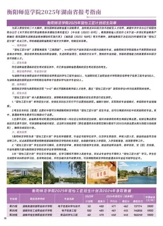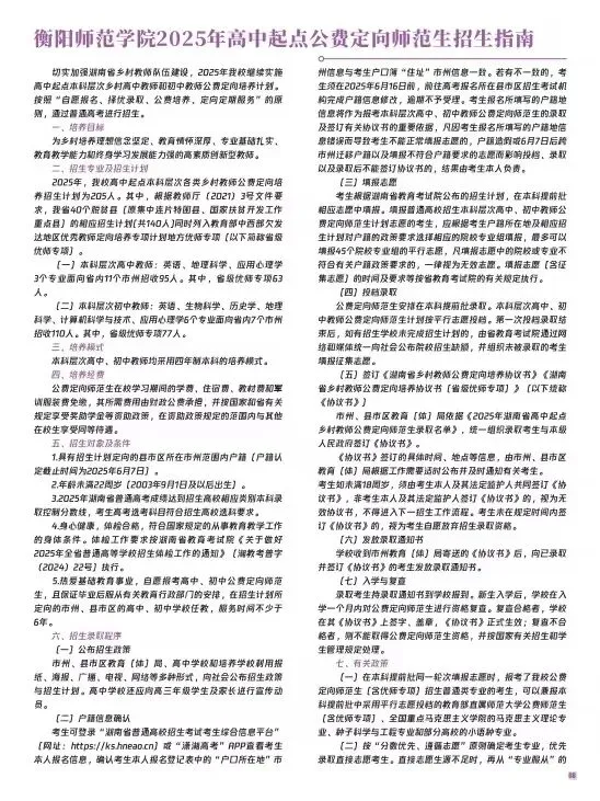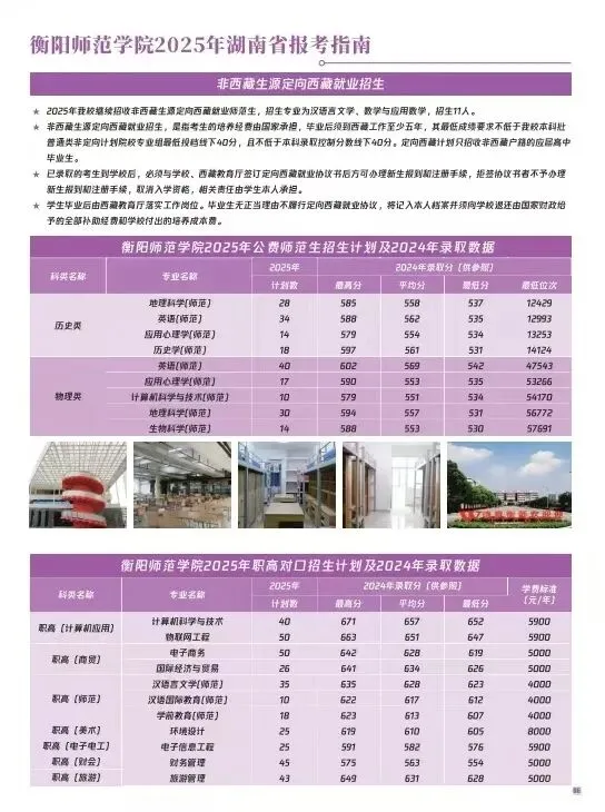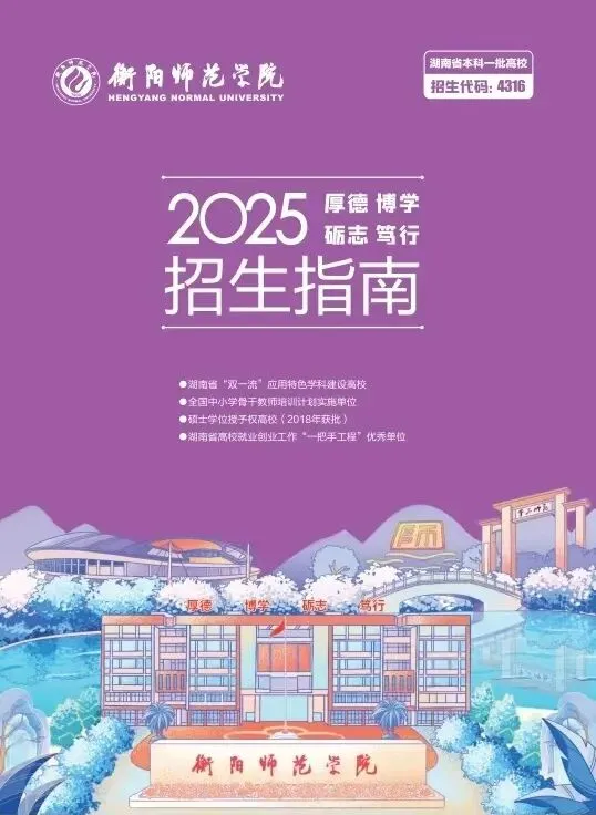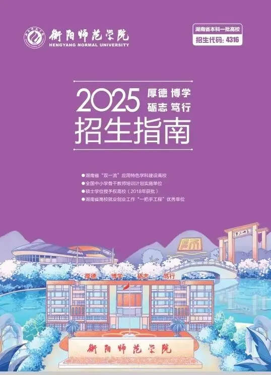 衡阳师范学院2025年招生指南电子版发布! 招生指南来啦 历经题海的跋涉与坚守即将叩响未来之门的你是否向往在酃湖畔看白鹭掠过波光是否期待在仁智楼听笔尖与知识碰撞 …… 衡阳师范学院 2025 年本科招生指南电子书 正式上线啦! 这所拥有120多年深厚底蕴的学府 带着满满的诚意 向你递出一份 “成长邀约” (点击图片即可打开指南↓↓↓) 选择衡师的十大理由 学科专业 2025年招生计划及2024年录取数据 特殊类型招生 楚怡工匠计划 非西藏生源定向西藏就业 地方专项计划 公费定向师范生 2024年外省录取数据 一审 | 张秀敏 二审 | 向 卓 三审 | 胡志超
