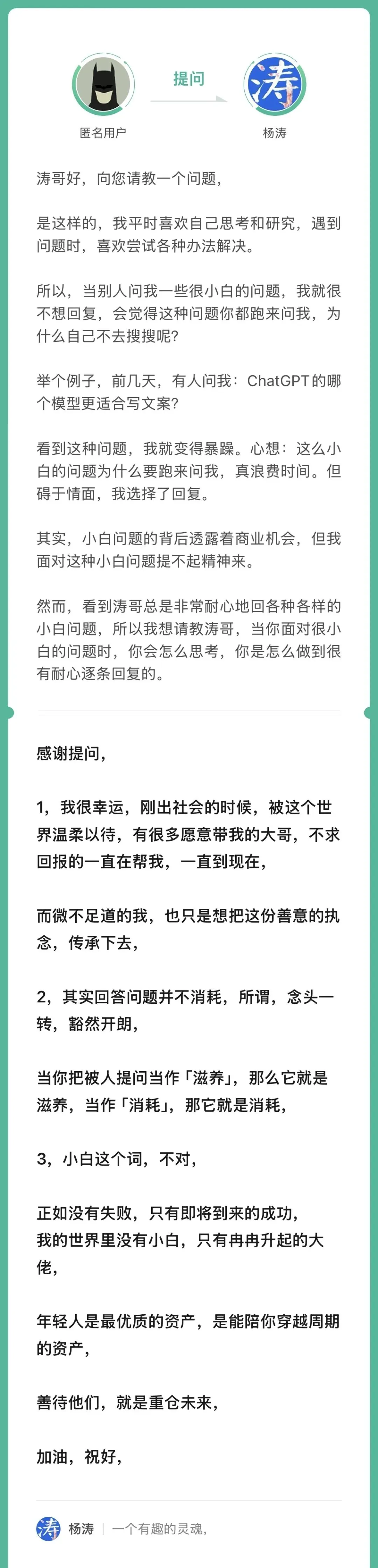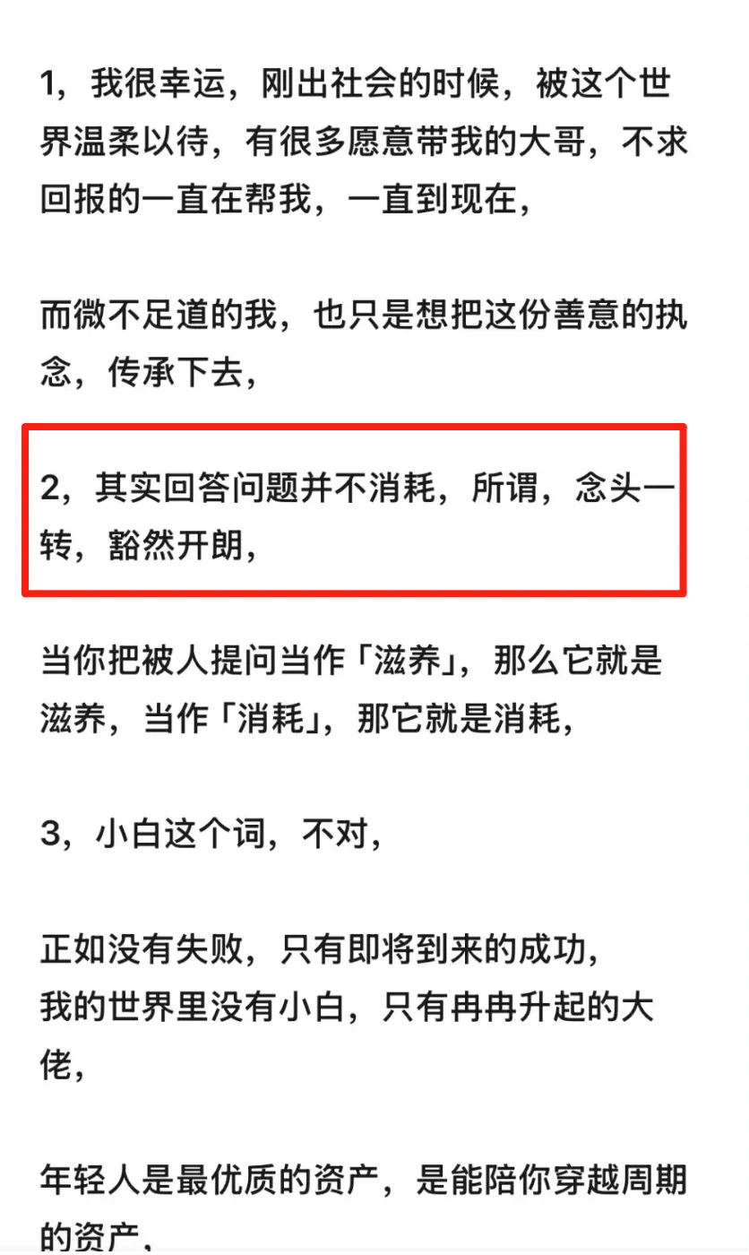 2 知识付费届,有一种默认的规则:没有付费就不要来找我提问,不要白嫖我。但涛哥,无论是谁来找他提问,有没有付费,他都会认真回答。