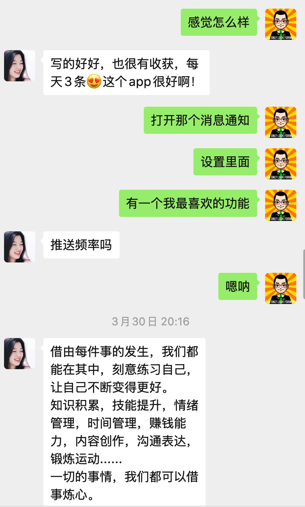 当你安装了这个 App 后,你就相当于,有这个世界上,最有智慧的一群人,每天 24 小时陪着你,每 1 小时,或者 30 分钟,给你轻轻讲一句话(主动弹出手机消息)