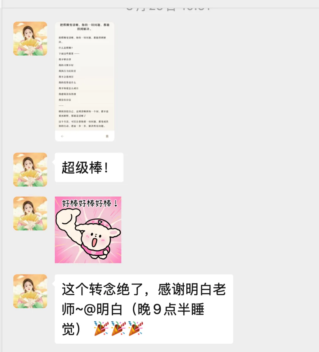 当我遇到一些烦恼、障碍、困惑、痛苦的时候,他们及时出现,在我耳边轻轻说了一句话。这句话刚好,能解决我的问题。