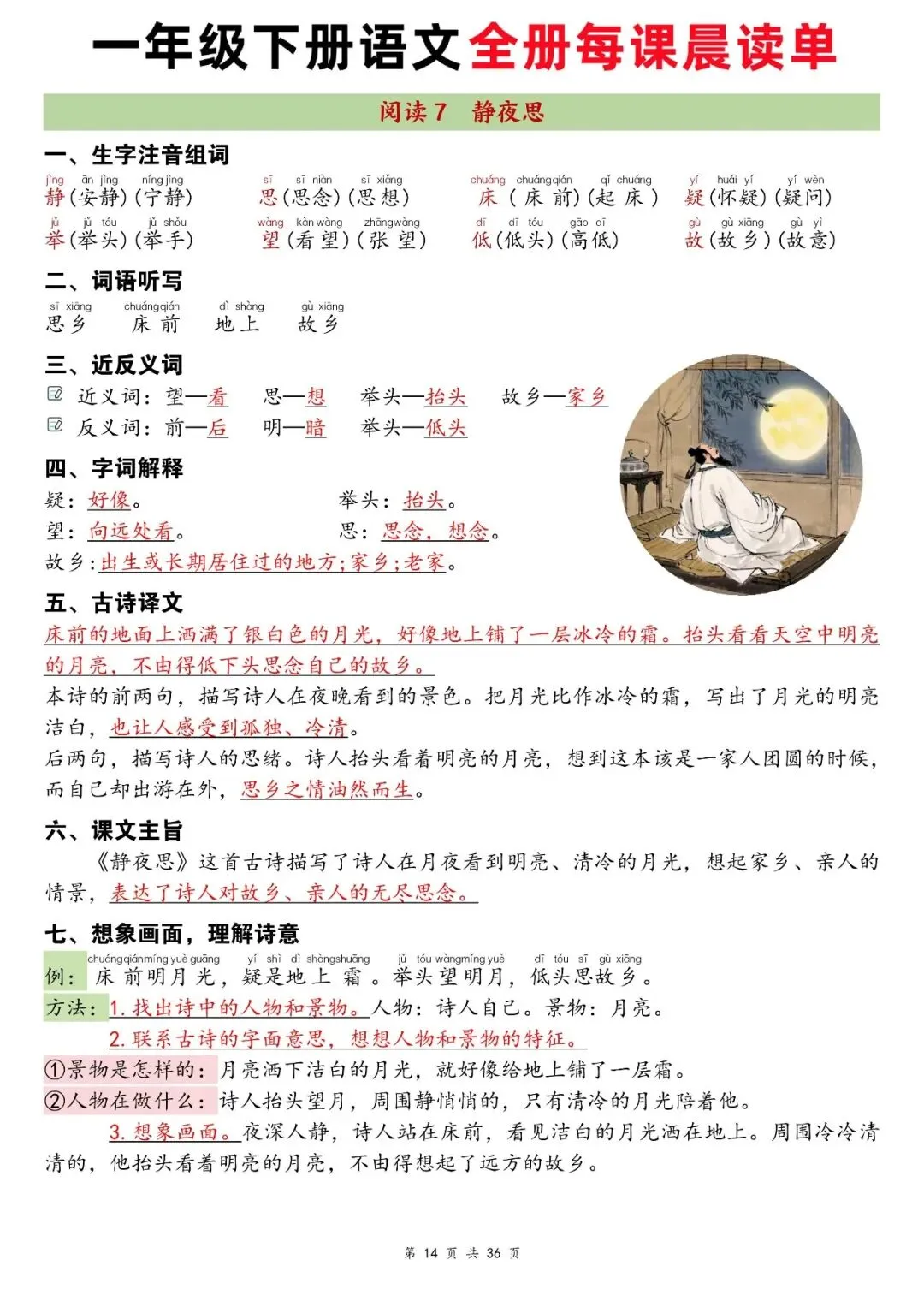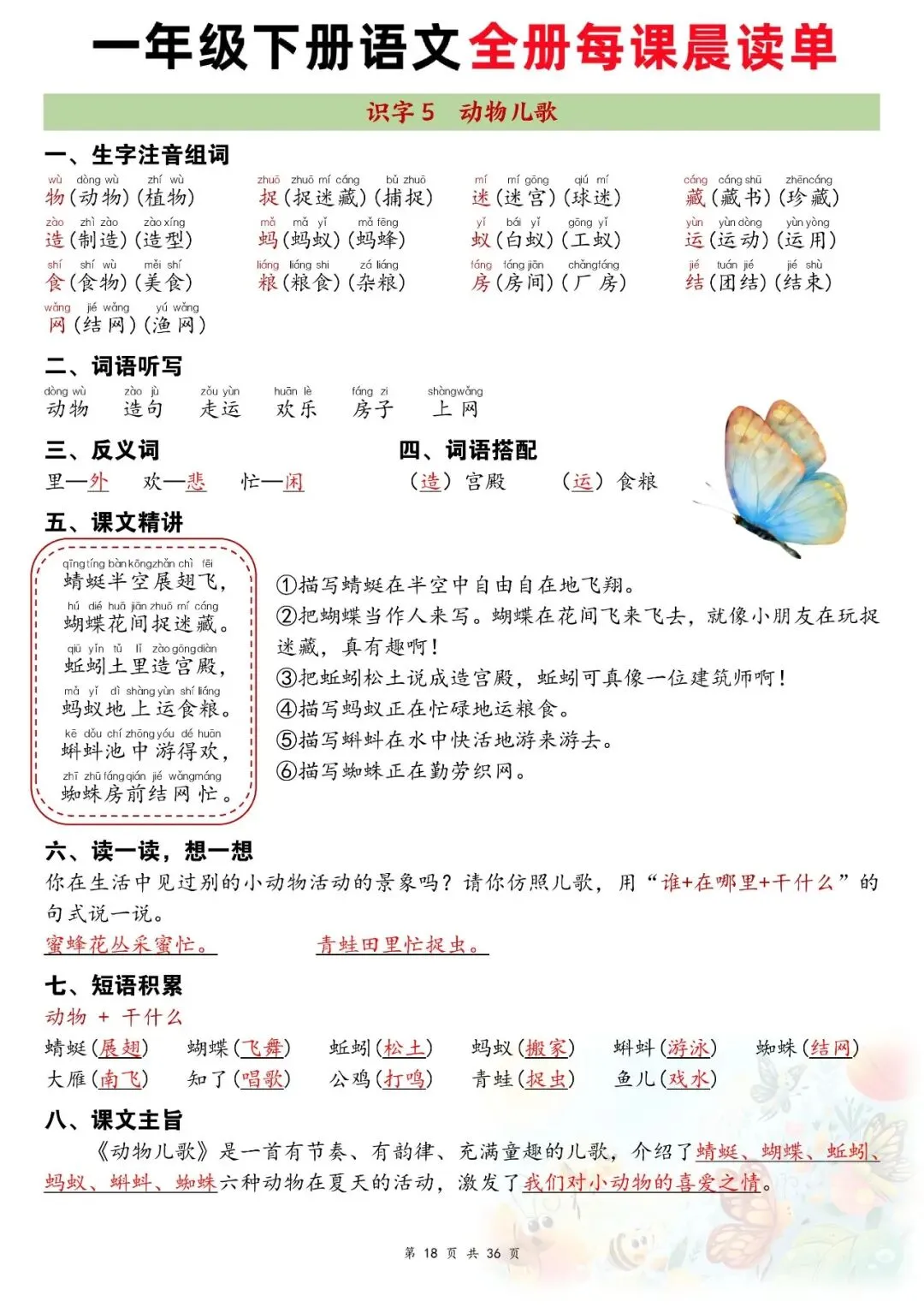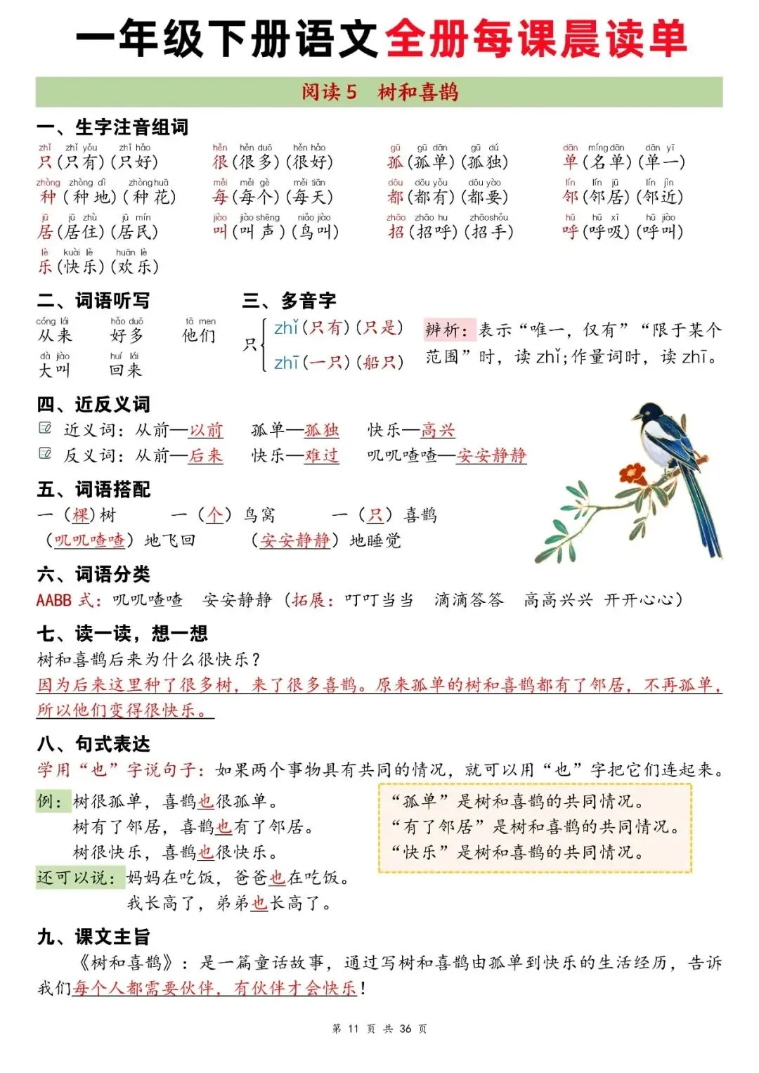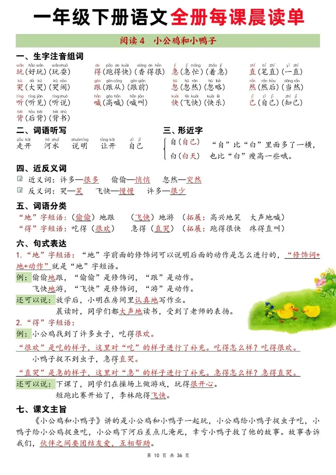 这份资料是一年级下册语文全册配套晨读材料,按课文顺序逐课整理,包含生字注音组词、词语听写、近反义词、词语搭配、句式仿写和课文主旨,内容紧贴课本,每天晨读 5-10 分钟,能帮孩子高效巩固字词、熟悉课文考点,打好语文基础。