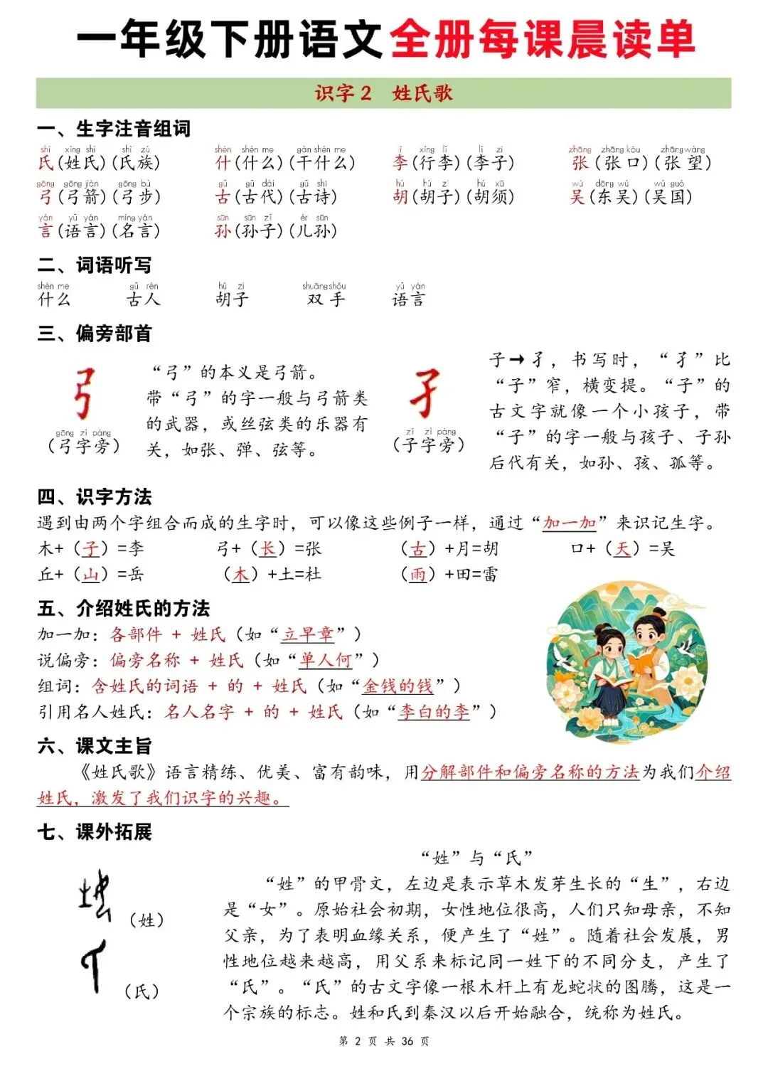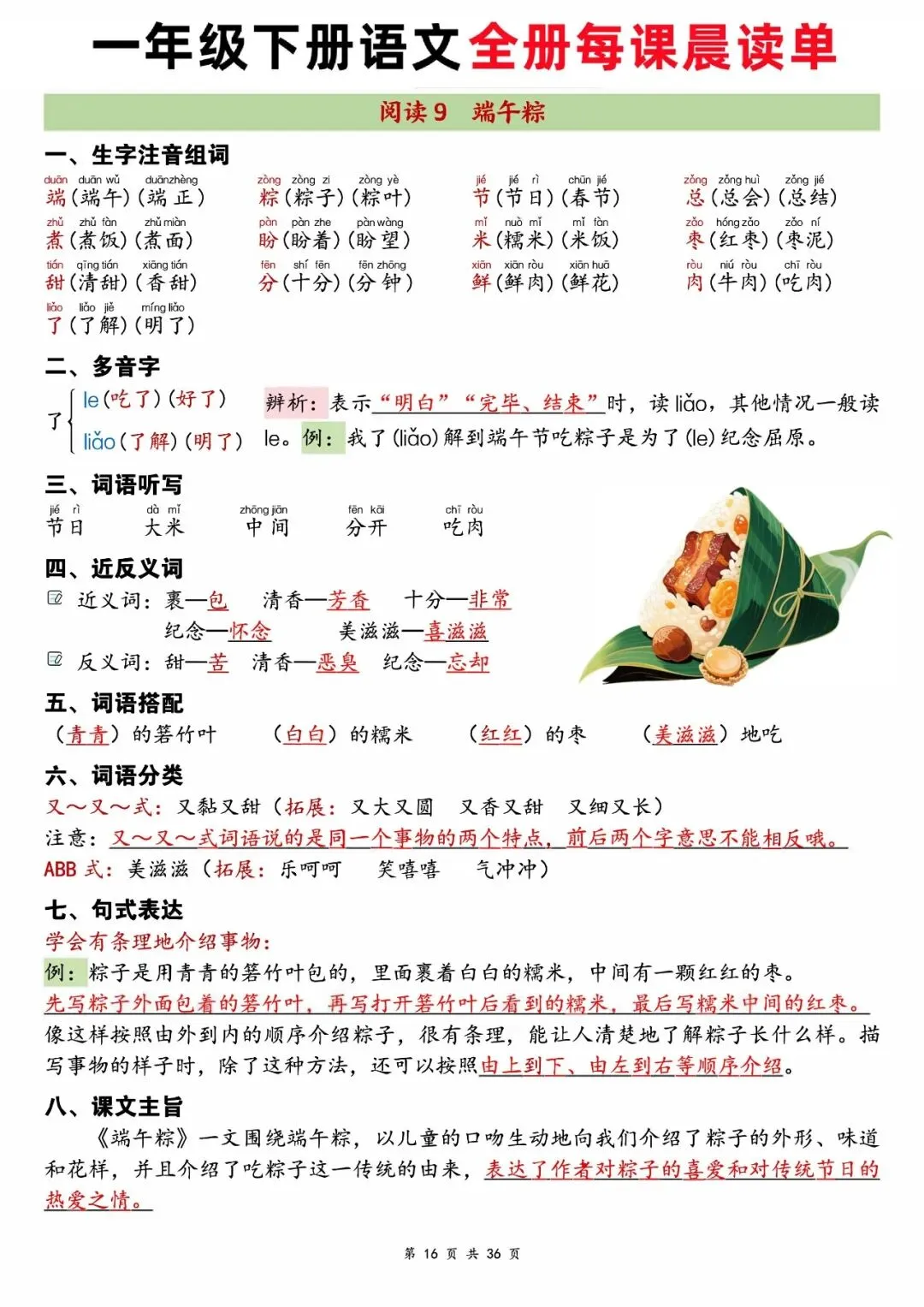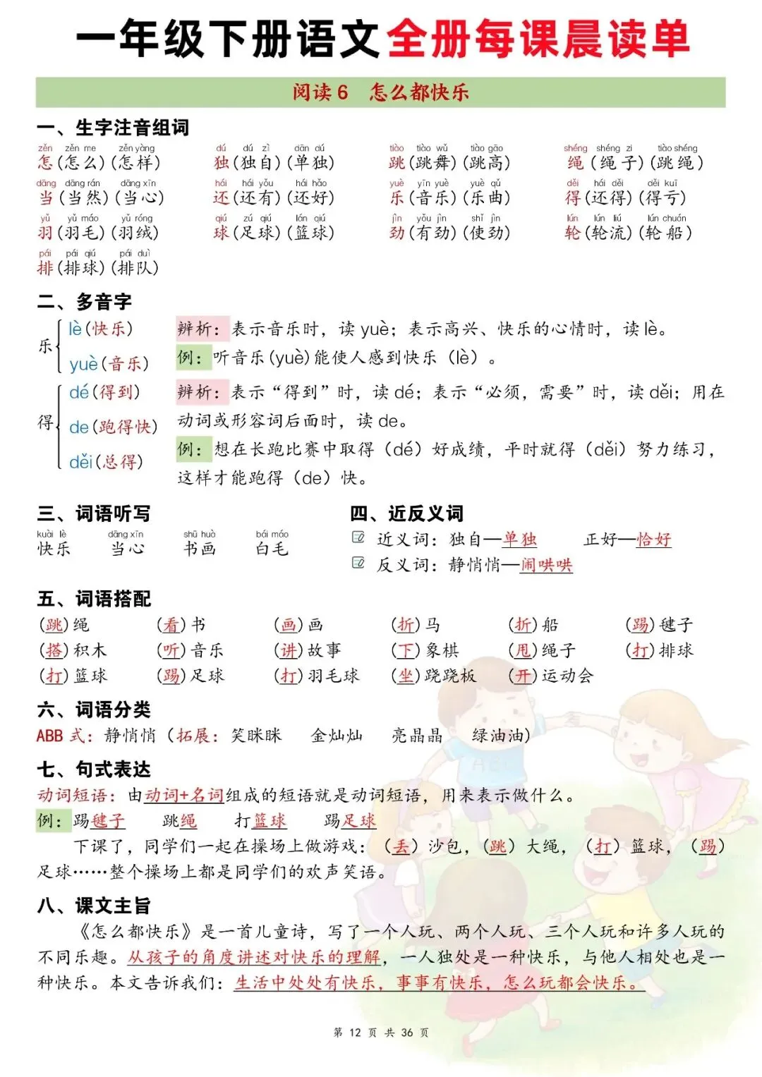 资料按识字、课文、语文园地系统编排,每课重点一目了然,还补充了偏旁归类、多音字、特殊句式等实用内容,适合孩子日常晨读、课前预习、课后复习,坚持使用能提升识字量、语感和答题能力。家长可以打印出来,让小朋友每天读一读,读的多了自然就记住了。