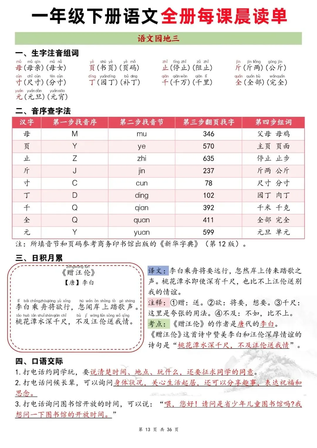 大家好,这里是淘学学资料库,这份资料是【一年级下册语文全册每课晨读单】,完整 pdf 电子版共 36 页,家长可打印出来让小朋友练习,公众号底部菜单查看完整 pdf 获取方式。
