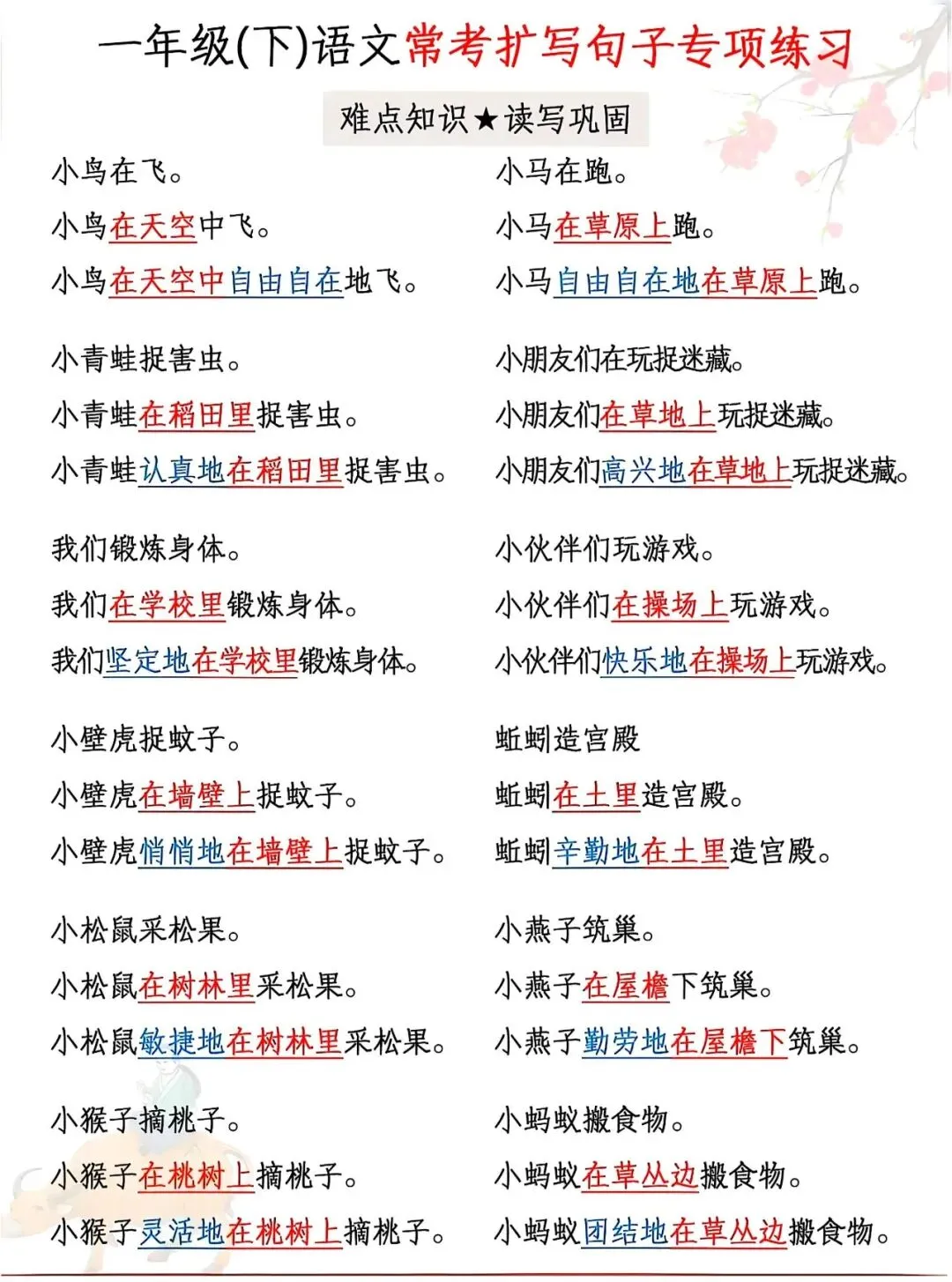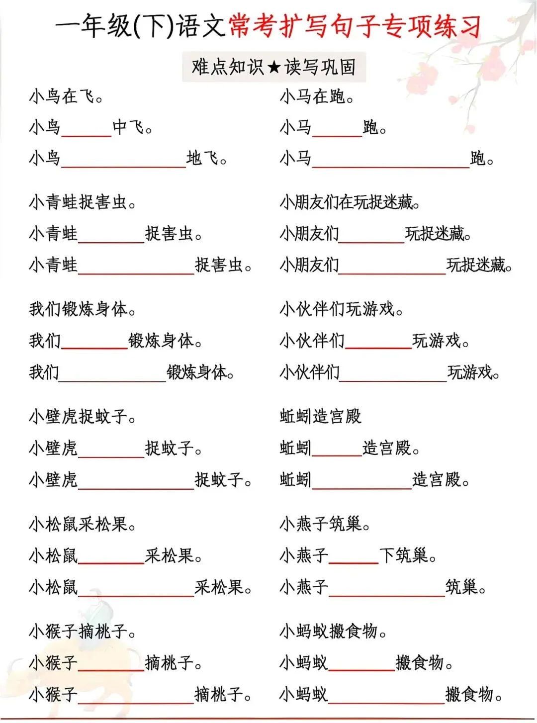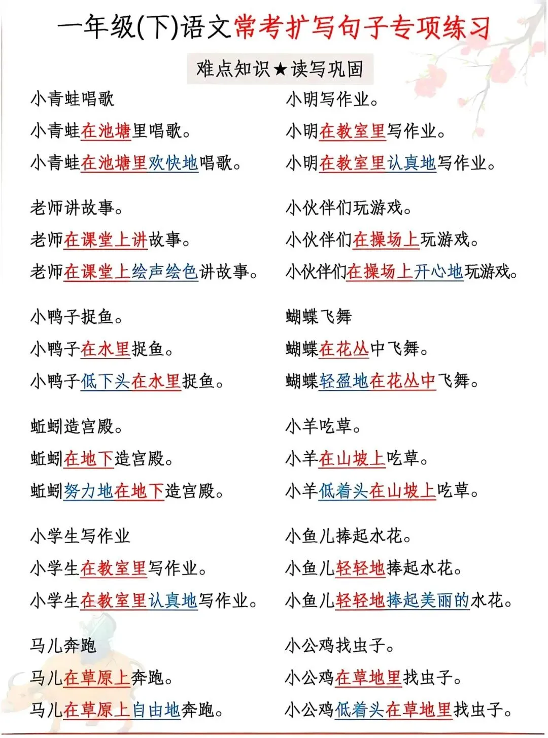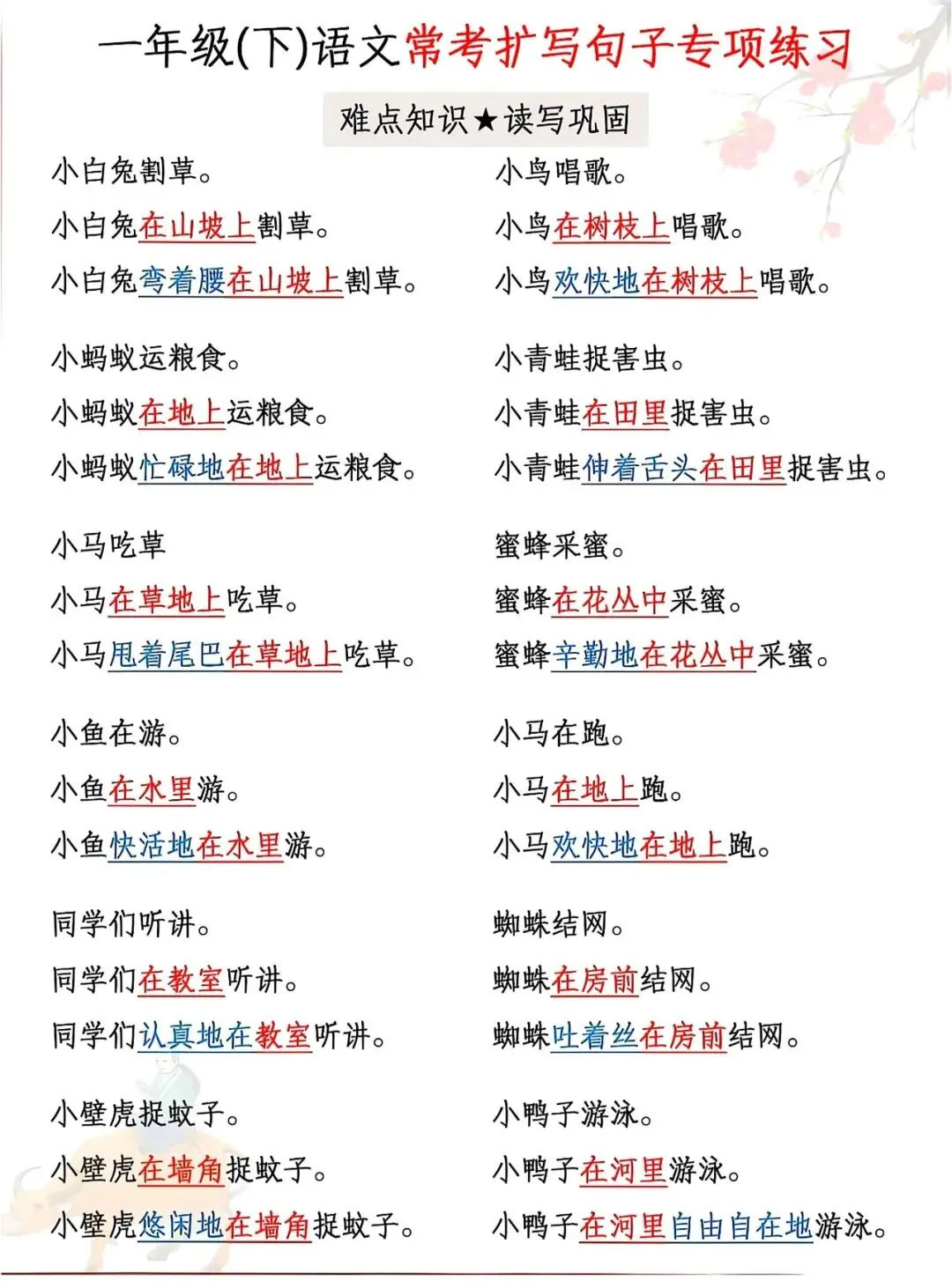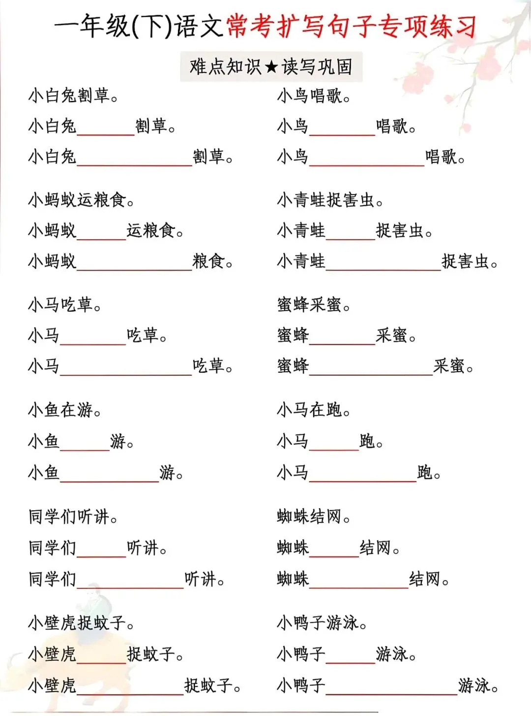 资料覆盖小青蛙、小鸭子、小白兔、小松鼠等课内高频事物,例句典型、练习针对性强,从基础扩写到规范表达循序渐进,还附带完整参考答案。每天练几组,既能巩固句式、提升语感,又能应对考试中的扩句题型,为写话和作文打好基础。