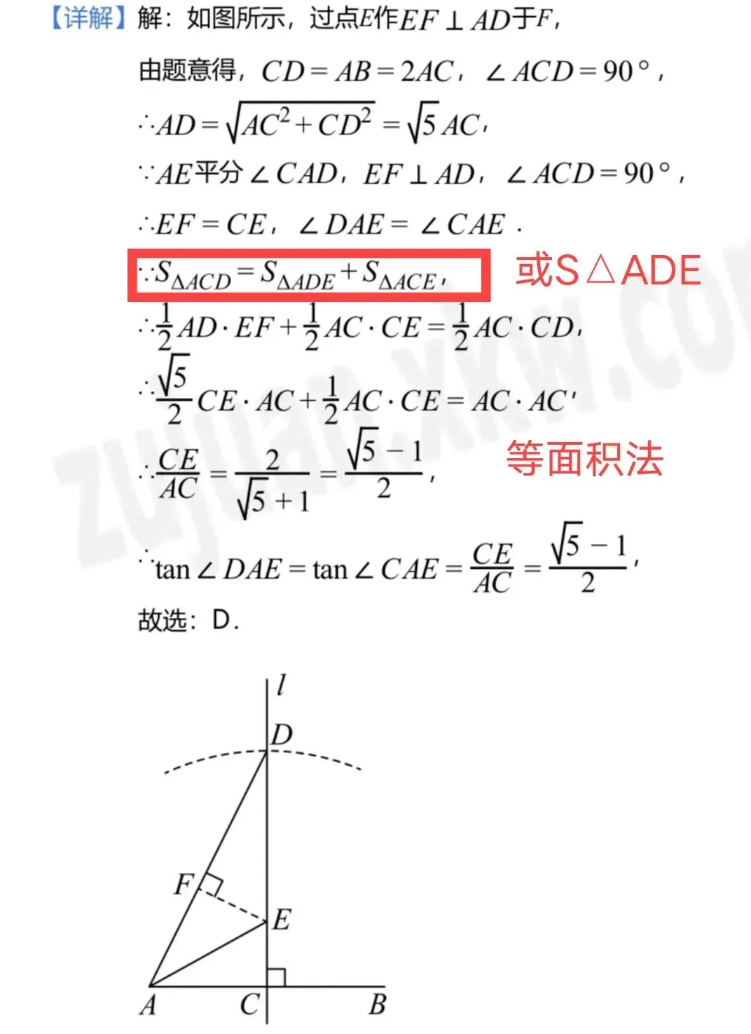 3. 用公式简化计算:借助不同三角形中同角或等角的三角函数如tanα,建立方程求解,跳过面积拆分等冗余步骤,直接得出结果。
