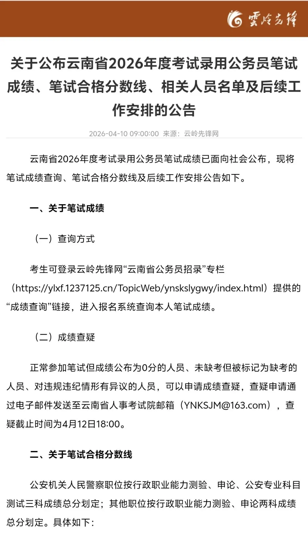 2026年云南省公务员招录笔试成绩排名及进面名单已正式发布!
