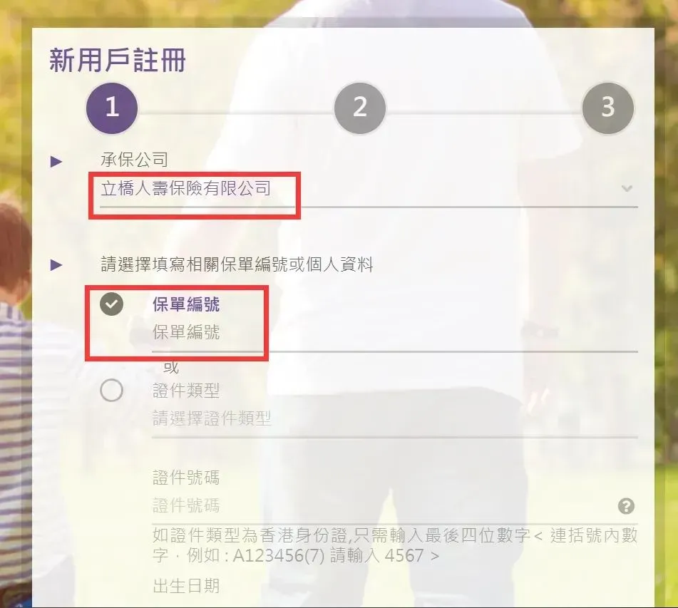 2.在“承保公司”选项中选择“立橋人寿保险公司”,然后输入保单编号和验证码