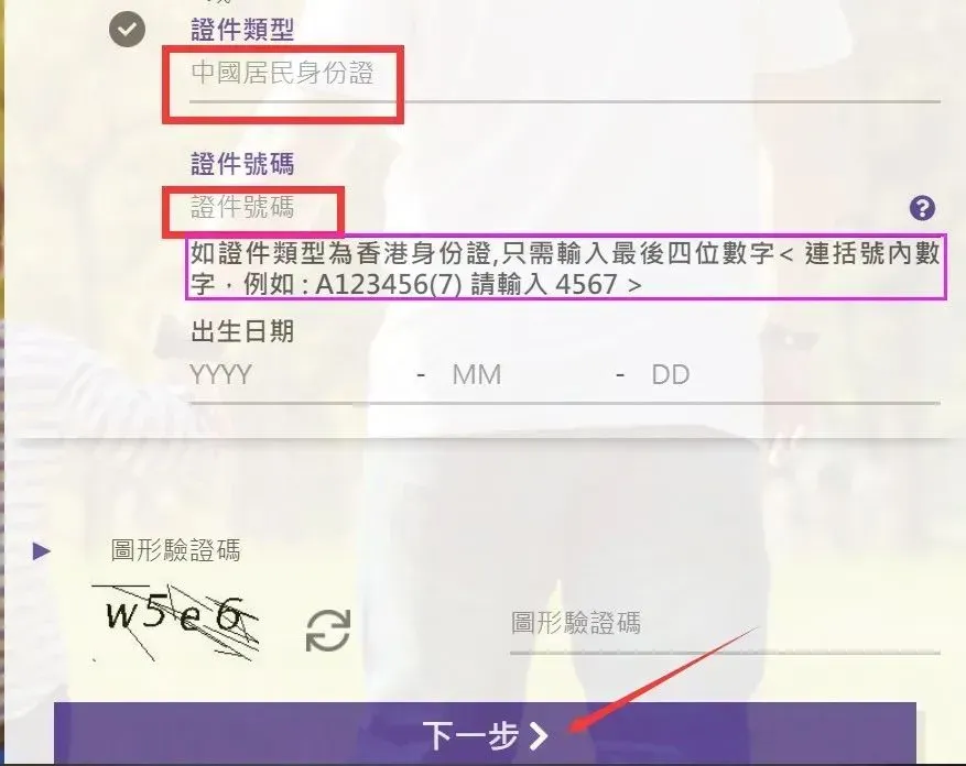 3.输入身份证号/护照后六位数字和出生日期。对于香港身份证,仅需输入后四位数字。