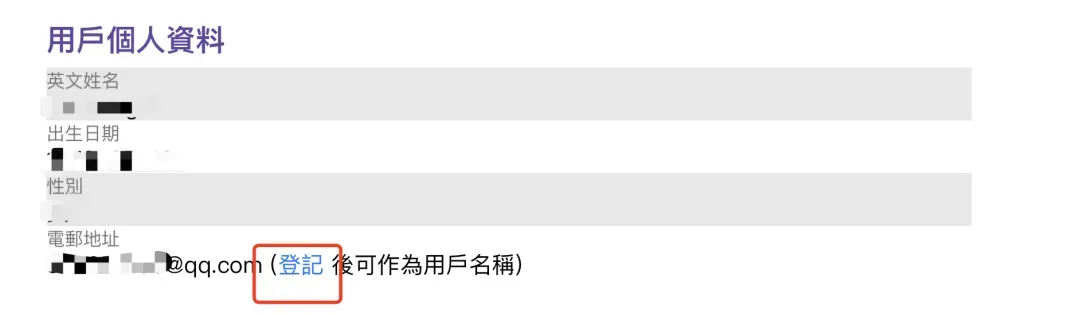 3. 登录后,显示个人信息页面,确认信息无误后,点击电邮后的“登记”。