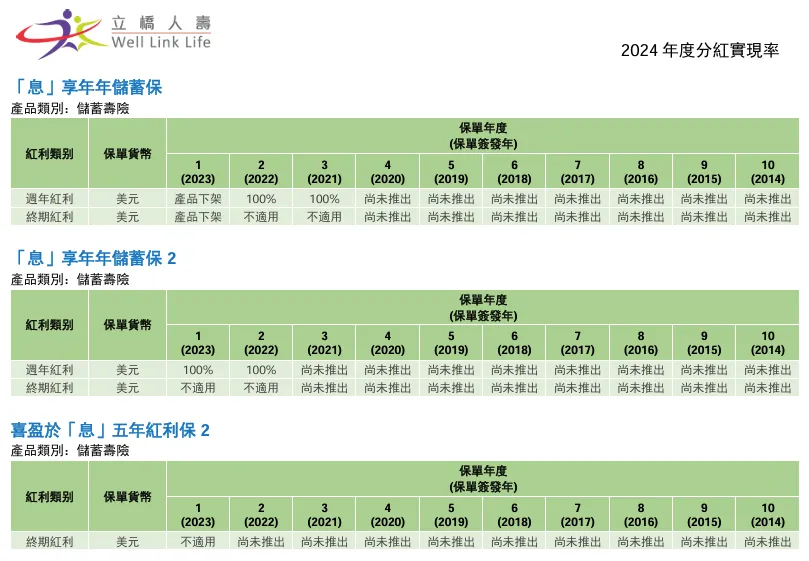由2019年启动业务至2024年度之相应保单周年日,立桥所有分红保险计划的分红实现率均为100%。