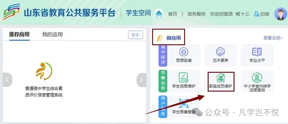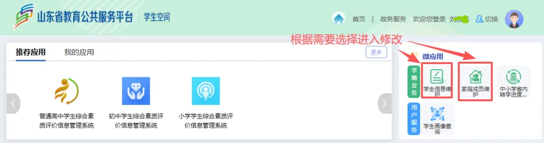 1. 进入家庭成员维护页面家长登录平台后,请在首页右上方找到并点击【微应用】,接着在【学籍业务】栏目下,点击【家庭成员维护】组件,即可进入家庭成员信息修改页面。