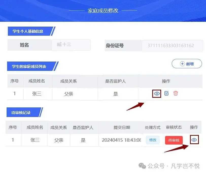 2. 进行信息维护在学校规定的时间内,您可以对家庭成员信息进行查看、新增、修改或删除操作。● 查看信息:点击列表中的【查看】按钮,即可浏览该家庭成员的详细资料。