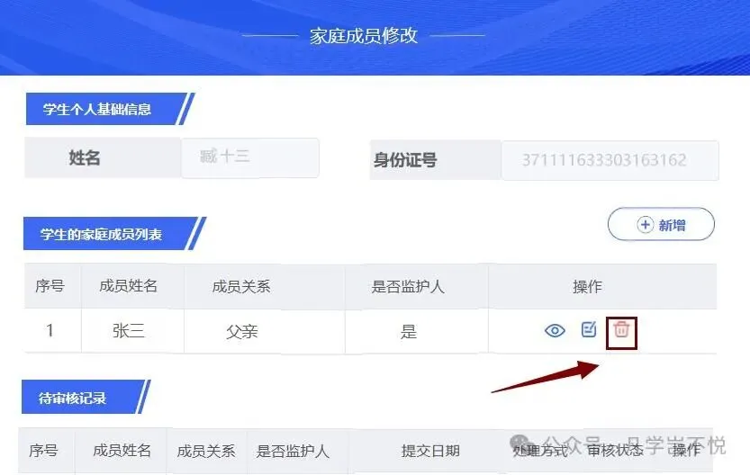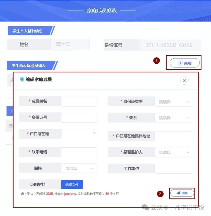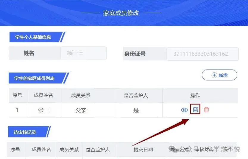 (3)修改:点击【修改】按钮,进入修改页面,修改家庭成员信息后点击【提交】,提交后由学校审核确认。
