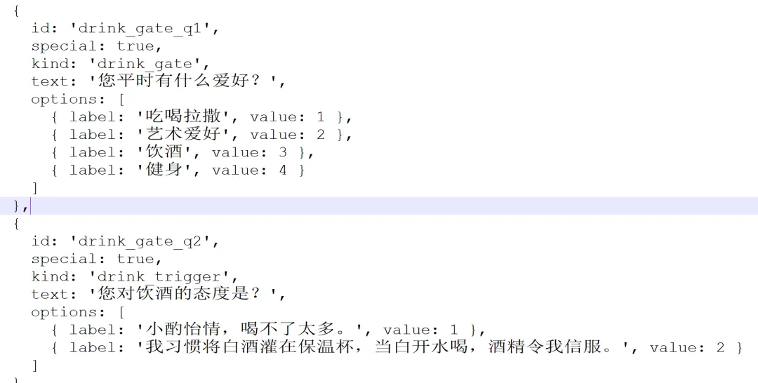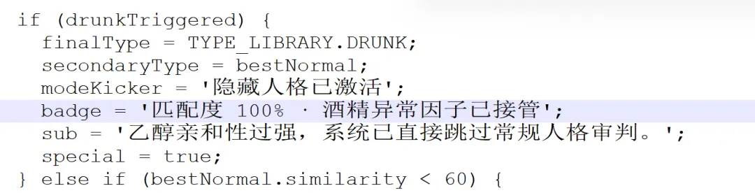 特殊题目是作者设置的小彩蛋:当爱好选了饮酒时,就会出来第二道题目,如果在第2道题目里选了2,那么会直接是隐藏人格:DRUNK