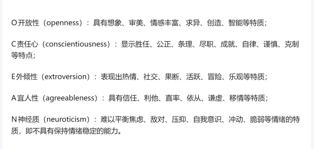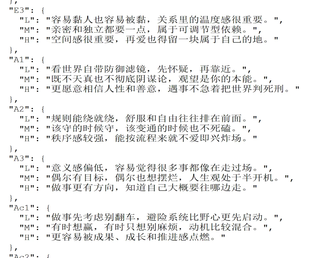 回到正常题目:正常的30道题里,每两道题目对应一个人格维度;总共设置了5个大类,细分成15个人格维度,每个维度分3个程度:
