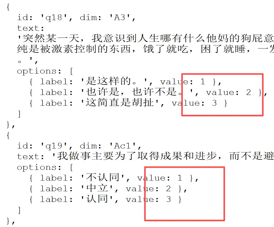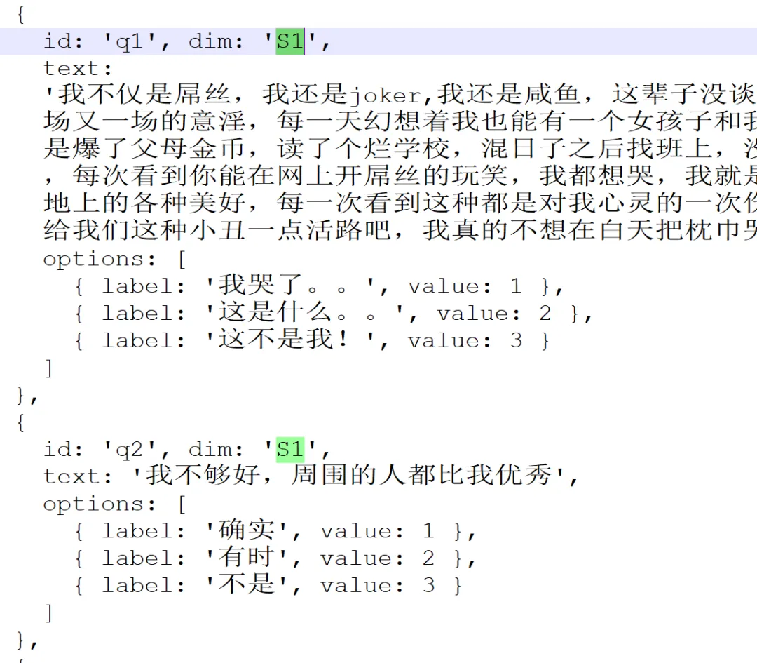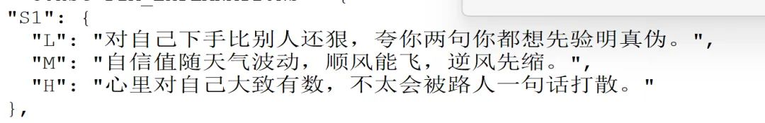 意思就是根据两道题目的得分,划分十五个人格维度里,其中一个维度的级别。比如,S1维度里的两个题目以及对应的三个级别: