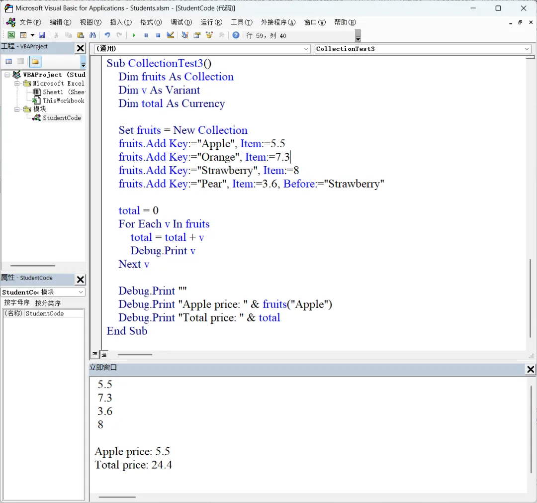 Dim fruits As Collection ' 声明 fruits 是一个 Collection 类型的变量Set fruits = New Collection ' 实例化 Collection,赋给 fruits 变量