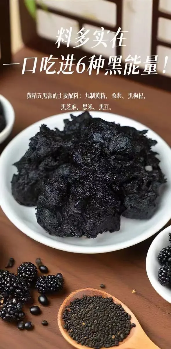 以黄精为核心,搭配黑芝麻、黑豆、黑枸杞、黑桑葚五种黑色食材,均富含花青素、多糖及氨基酸,形成“五黑”