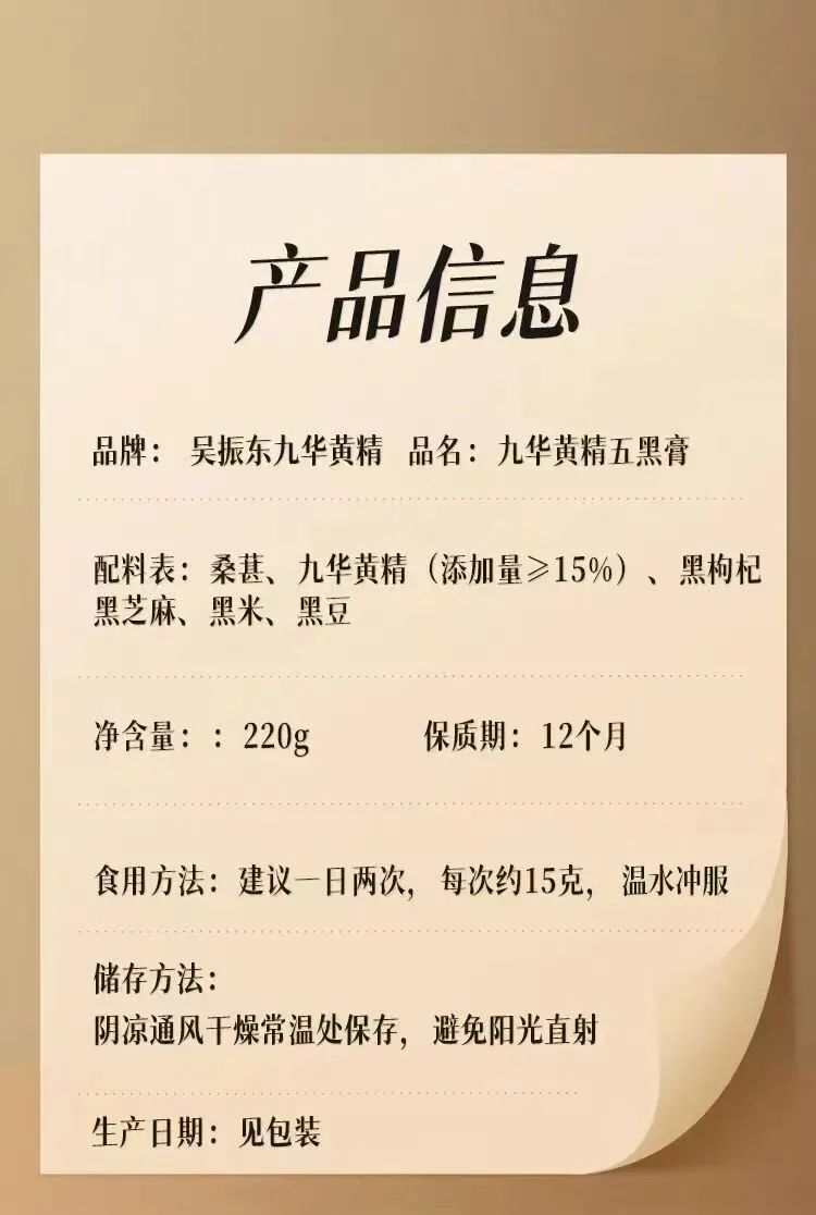 配料:桑葚、九华黄精(添加量>15%)、黑枸杞、黑芝麻、黑米、黑豆