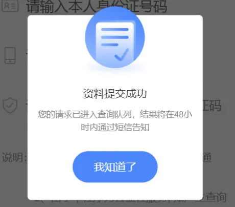 2. 填写姓名、身份证号码后六位和手机号,获取验证码提交,48小时内,系统会通过10699000专用短信端口回复查询结果,告诉你名下该手机号绑定了多少个互联网账号。