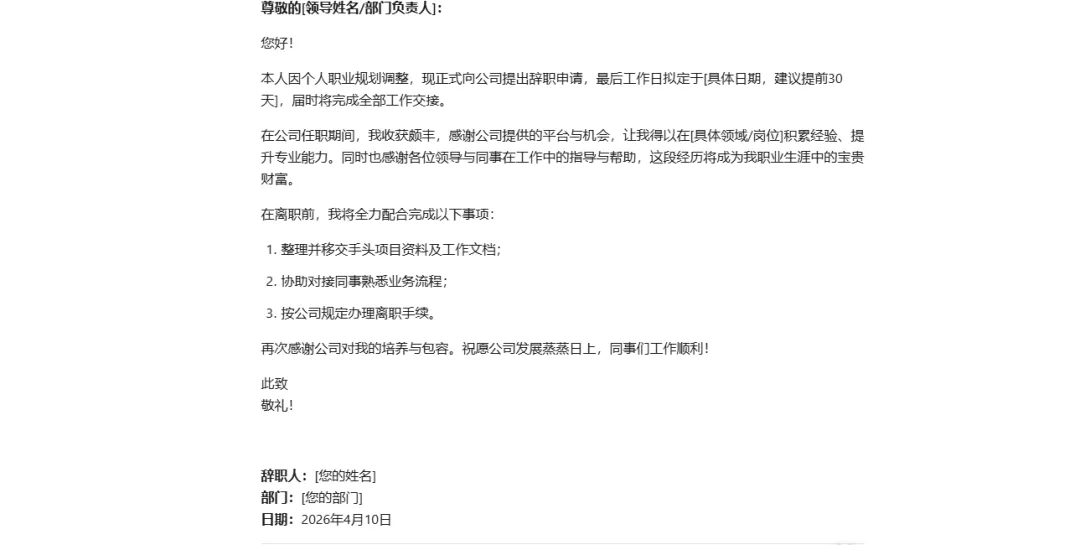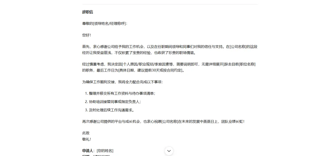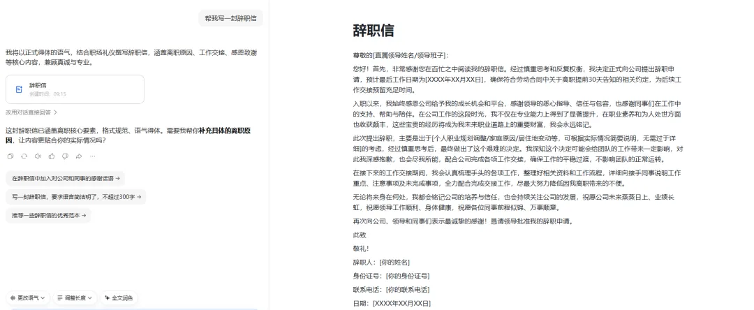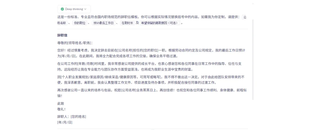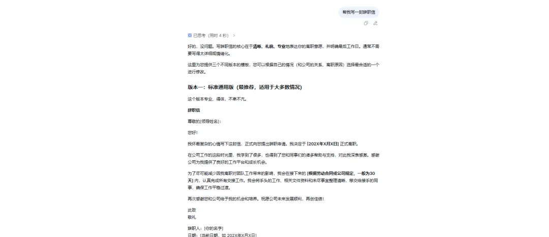 测试的问题是”帮我写一封辞职信”。选择这个问题是因为它足够具体,又需要一定的情商和表达技巧。