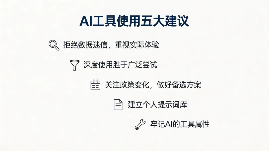 第五,别忘了AI是工具,不是目的。它能帮你提升效率,但核心是你的判断力和创造力,这点最重要,永远别丢。
