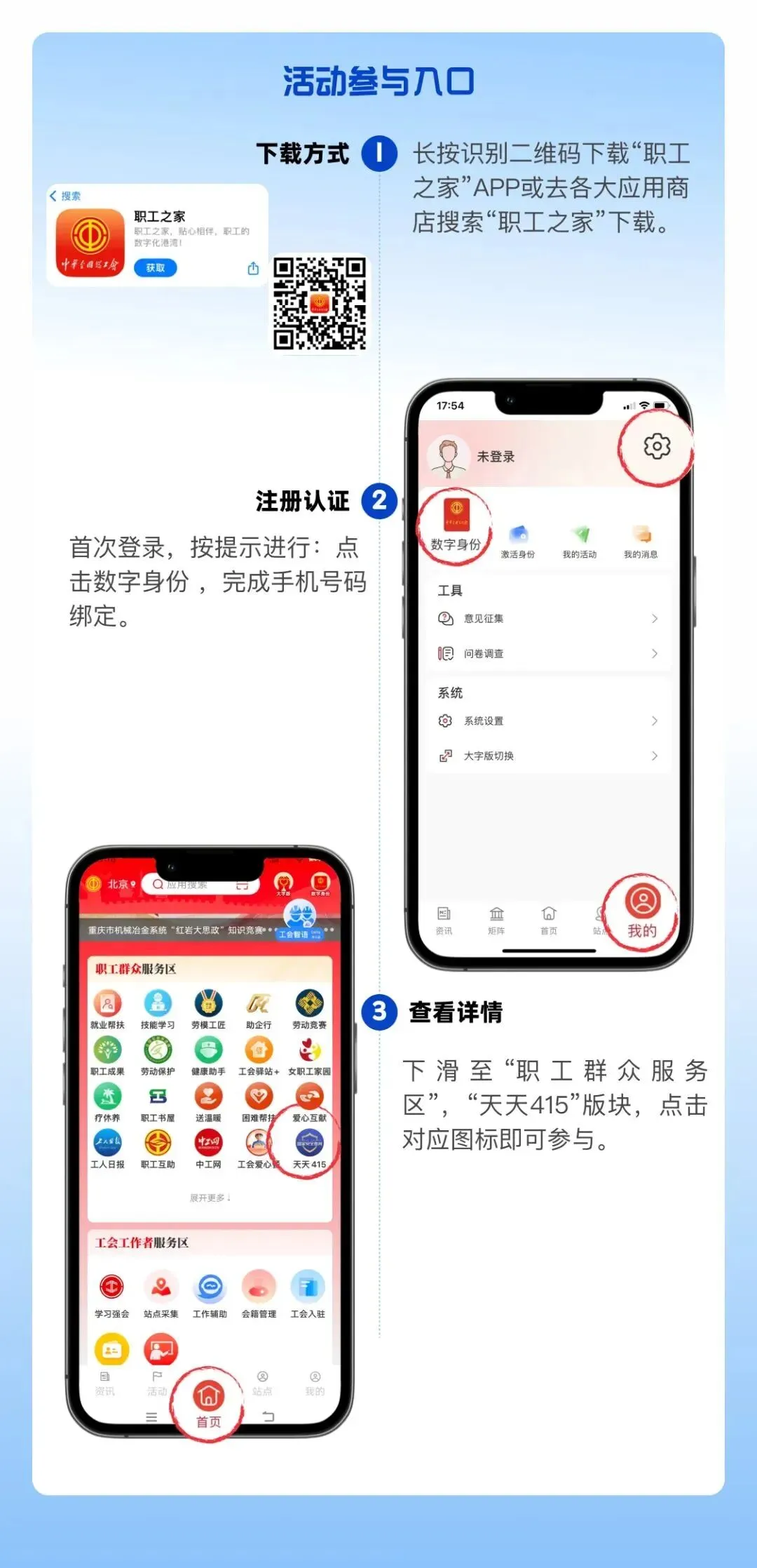 1.进入“职工之家”APP,下滑至“职工群众服务区”,点击进入“天天415”模块。