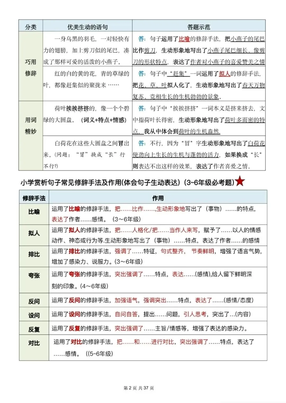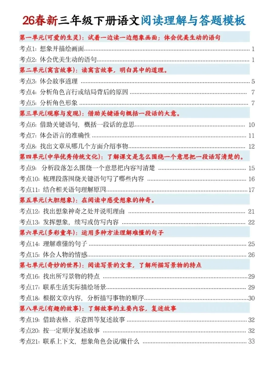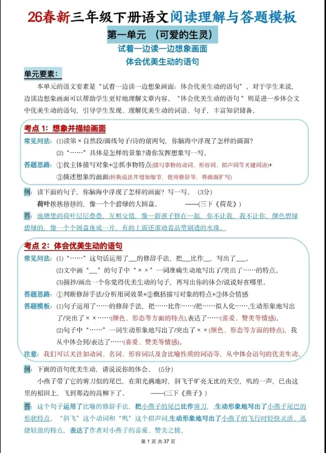 三年级下册语文《阅读理解与答题模版》,电子版可打印