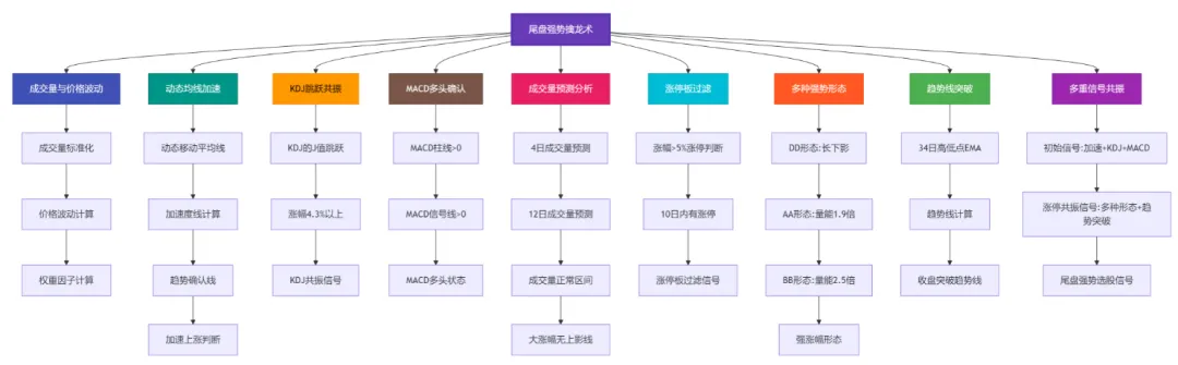 尾盘强势擒龙术:多重技术共振选股是一个综合性的尾盘选股系统,通过多个技术维度的共振筛选潜在的强势股。成交量与价格波动模块将成交量标准化,计算价格波动幅度,并根据两者中的较大值计算权重因子。动态均线加速模块通过动态移动平均线计算加速度线和趋势确认线,当加速度超过0.24、趋势确认线超过0.005、当日上涨时,判断为加速上涨状态。KDJ跳跃共振模块要求KDJ的J值单日上涨超过5,且当日涨幅超过4.3%,这是短期强势的表现。MACD多头确认模块要求MACD柱线和信号线都大于0,确保中期趋势向上。成交量预测分析模块通过预测未来4日和12日的成交量,判断当前成交量是否在正常范围内,结合大涨幅和无上影线条件筛选。涨停板过滤模块判断当日涨幅是否超过5%(涨停阈值),且10日内有过涨停,用于筛选强势股。多种强势形态模块定义了三种典型形态:DD形态(涨幅5%以上、长下影线、低点创新低)、AA形态(量能放大1.9倍、涨幅4.9%以上、上影线短)、BB形态(量能放大2.5倍、涨幅5%以上、上影线短)。趋势线突破模块通过34日高低点的双重EMA计算趋势线,要求收盘价站在趋势线上方。多重信号共振模块将初始信号(加速上涨+KDJ共振+MACD多头)和涨停共振信号(多种强势形态+趋势突破+涨停过滤)进行组合,生成最终的尾盘选股信号。