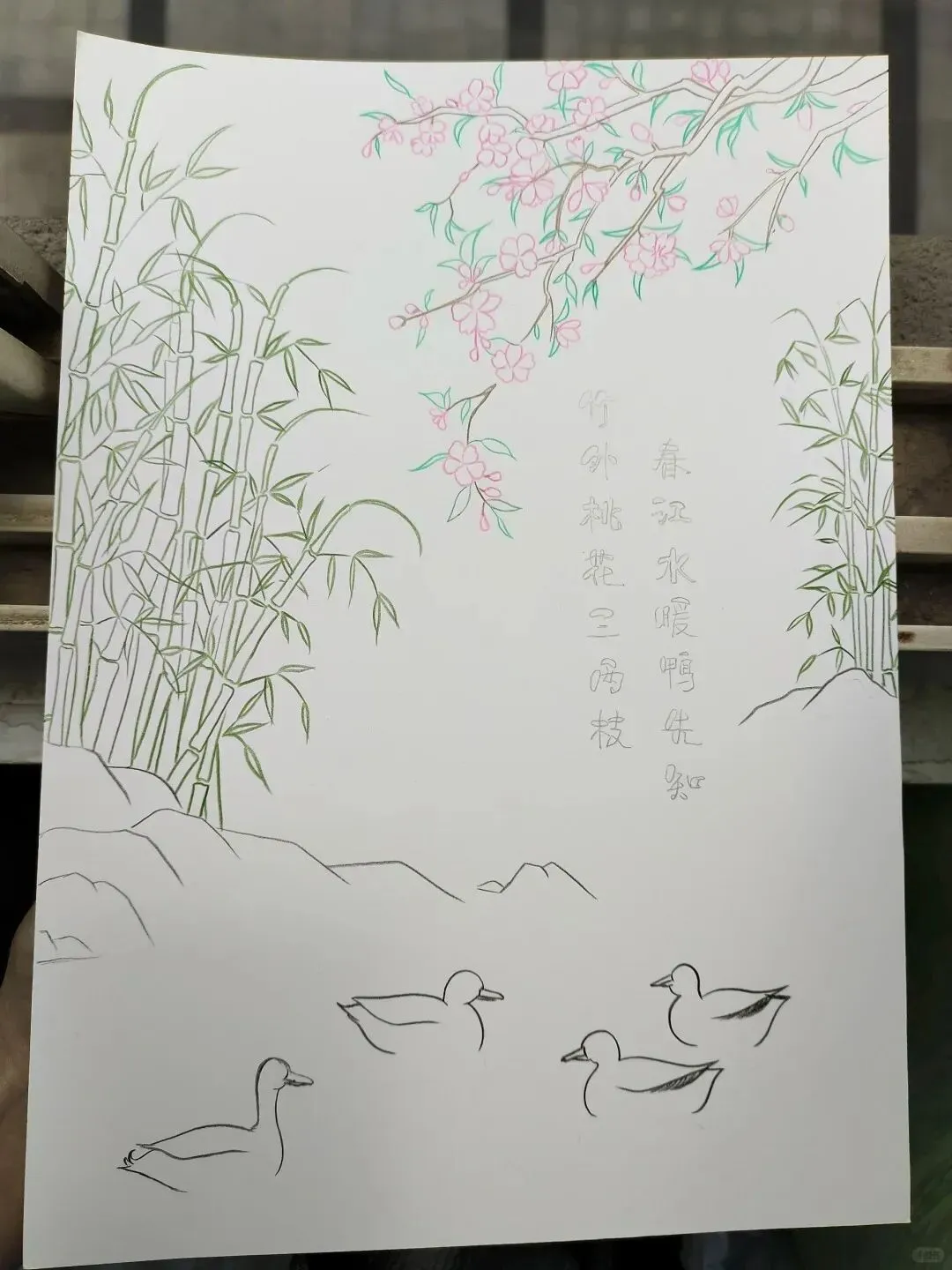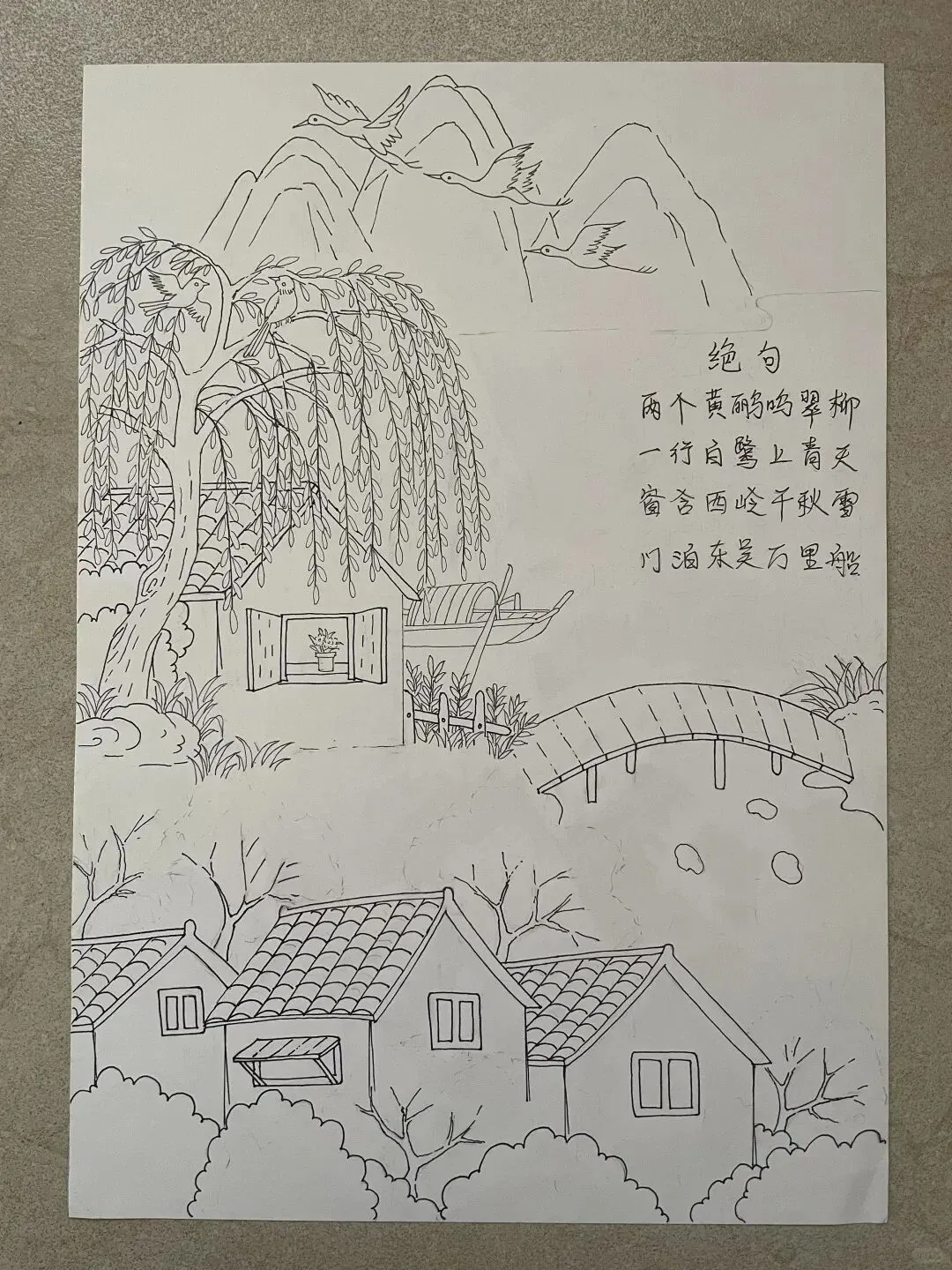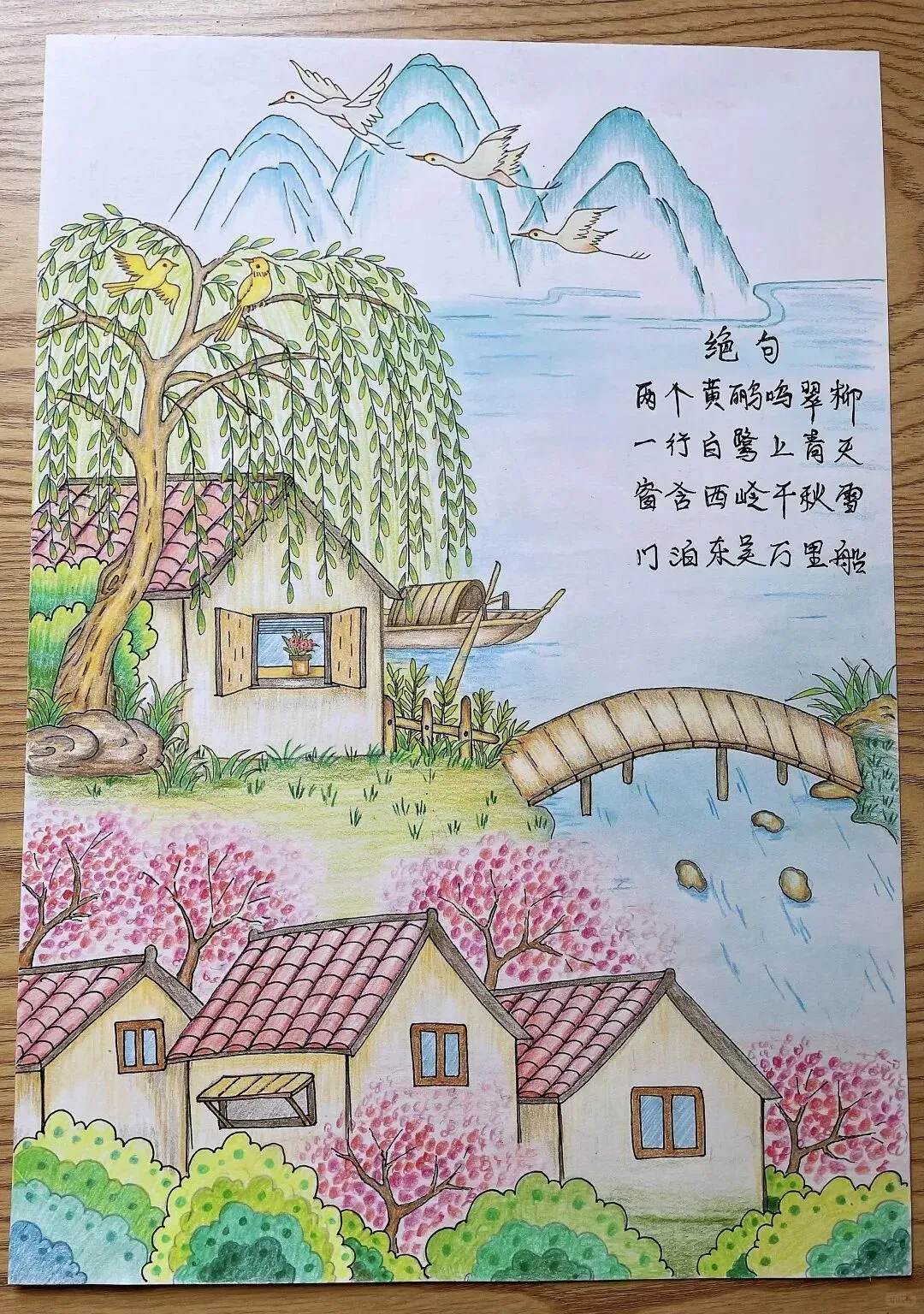 《彩铅画 两个黄鹂鸣翠柳,一行白鹭上青天》