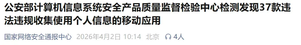 依据《网络安全法》《个人信息保护法》等法律法规,经公安部计算机信息系统安全产品质量监督检验中心检测,37款移动应用存在违法违规收集使用个人信息情况,具体通报如下: