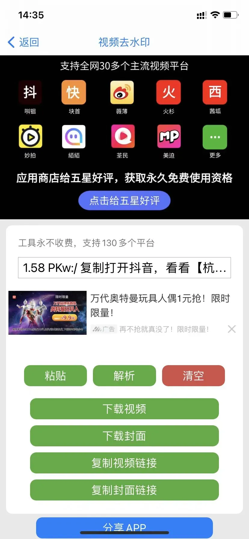 软件其支持130多个短视频平台,可无水印下载视频、下载封面等,软件还内置了视频、图片各种工具合集,也算一个小亮点吧。不过软件有广告,但是可以跳过,在可以接受的范围,毕竟免费使用了看会也无妨。