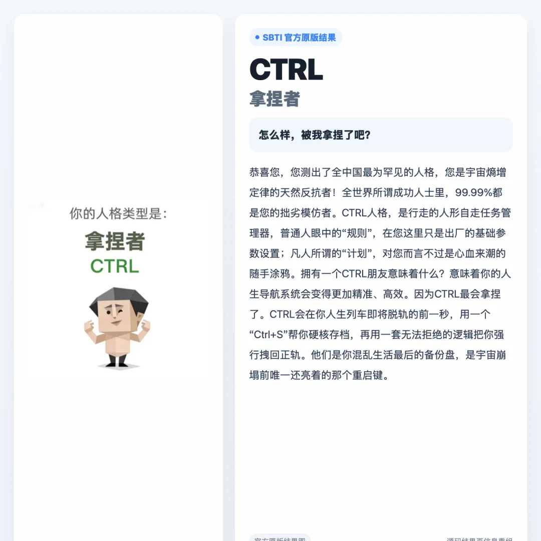 如果只是恶搞,它最多火一阵梗图。但 SBTI 不一样,它不是纯胡来,它是那种表面抽象,里面其实很会拿捏人心的东西。