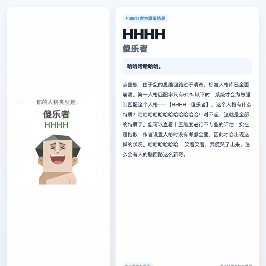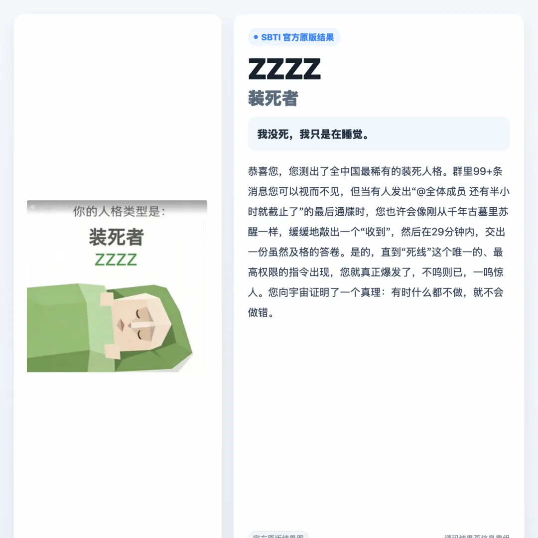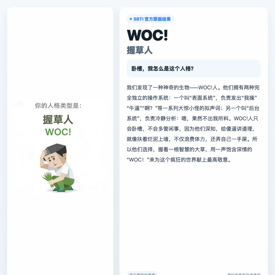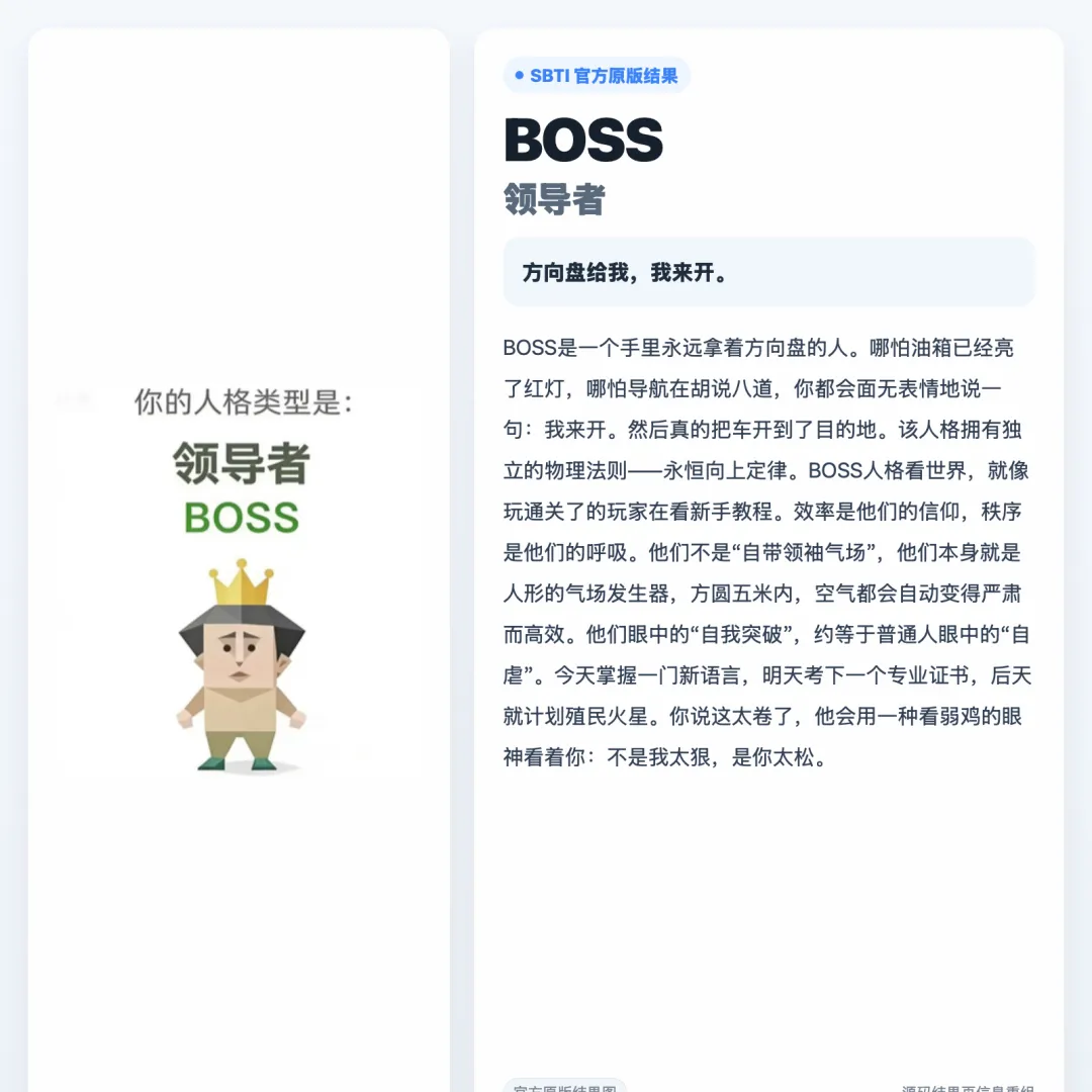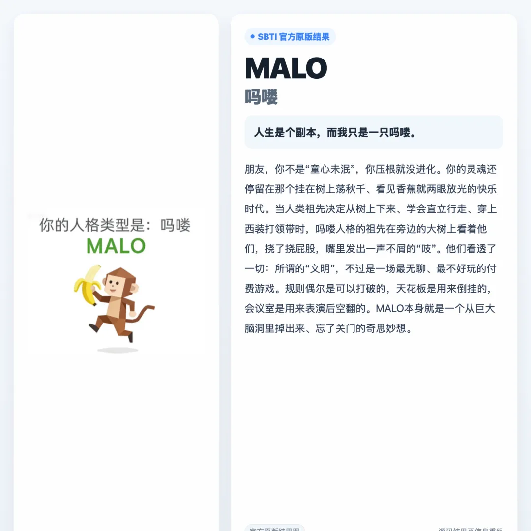 它能爆,是因为它从一开始就没打算做一个严肃的人格测试。 它真正做的,是把年轻人的疲惫、摆烂、内耗、嘴硬、自嘲和发疯,统统做成了一张适合截图发出去的结果页。
