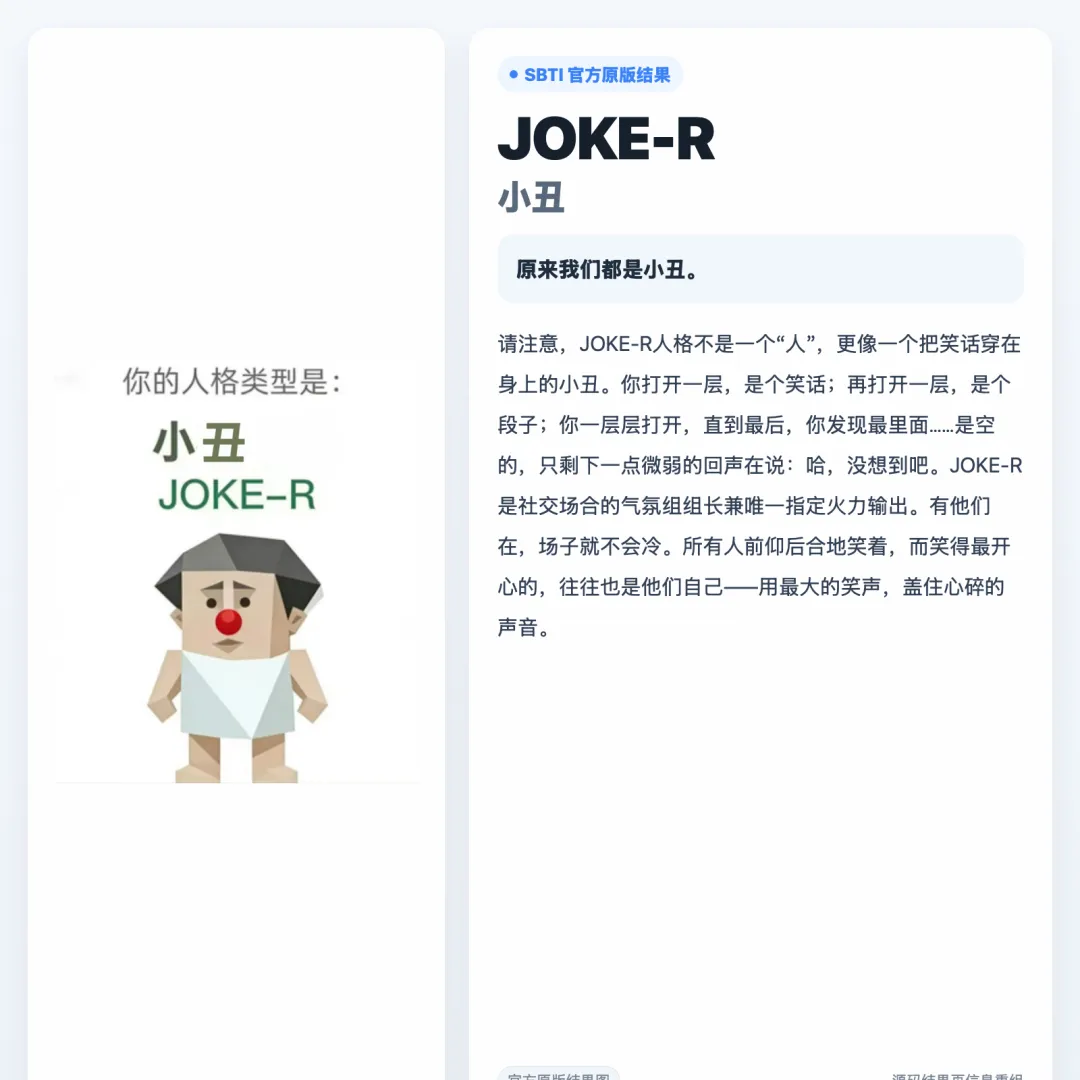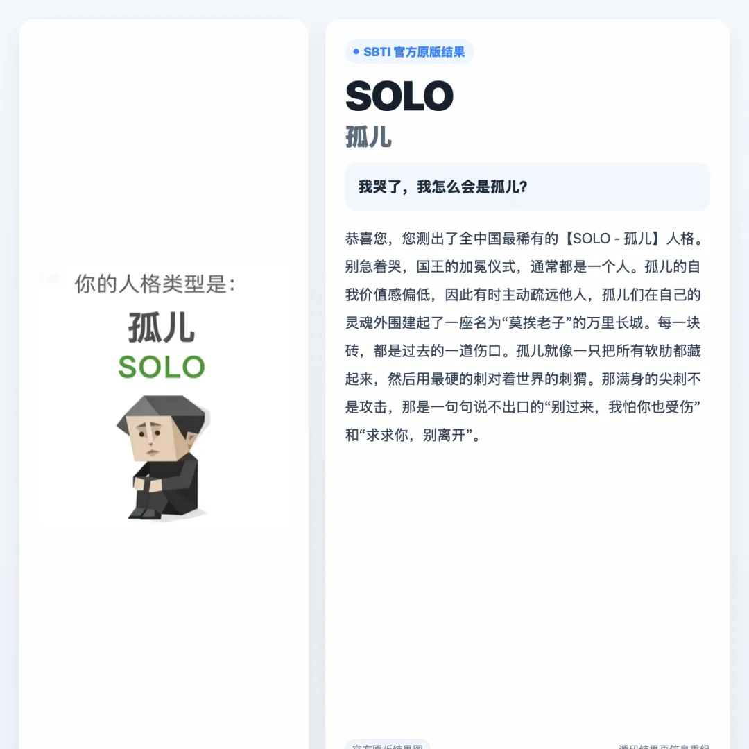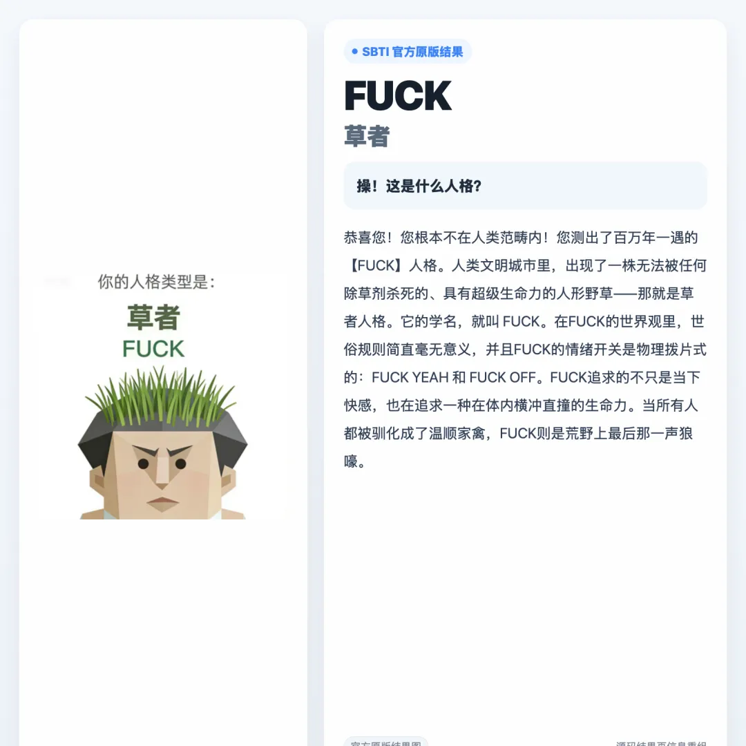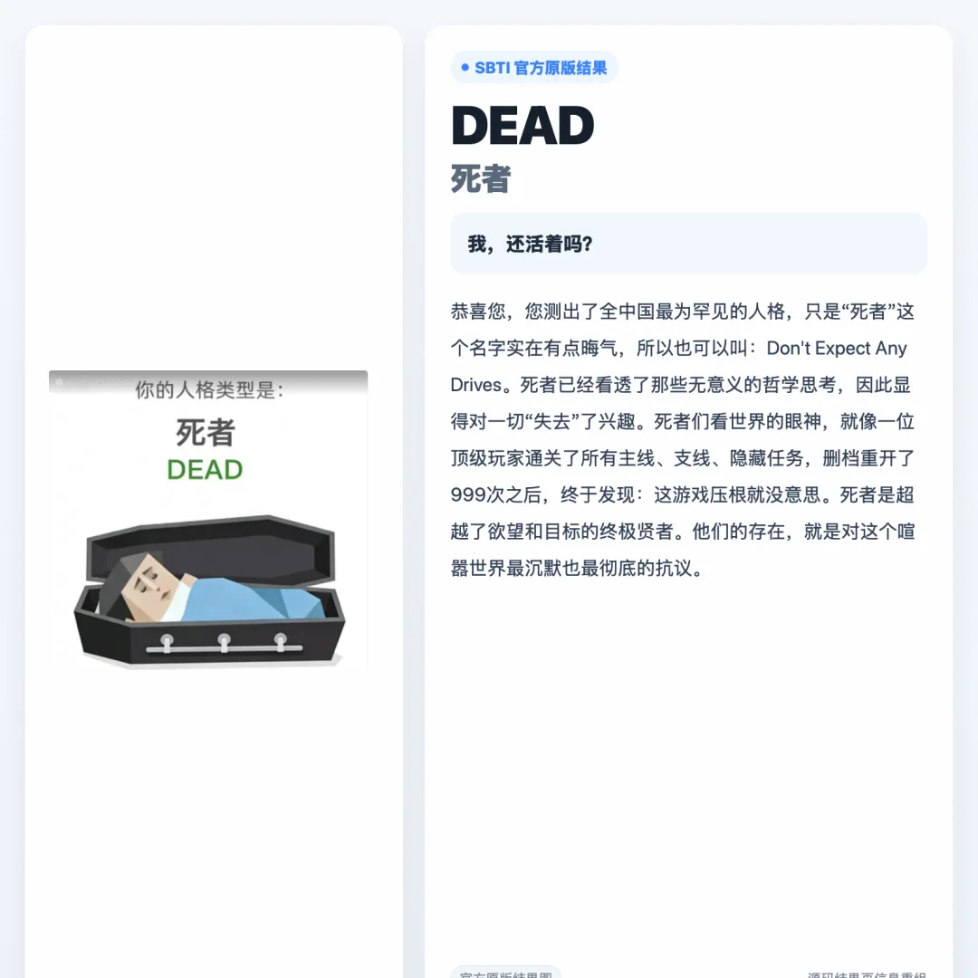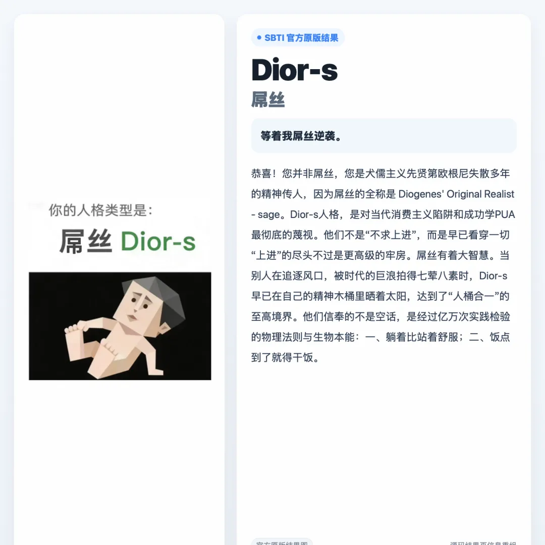 它能爆,是因为它从一开始就没打算做一个严肃的人格测试。 它真正做的,是把年轻人的疲惫、摆烂、内耗、嘴硬、自嘲和发疯,统统做成了一张适合截图发出去的结果页。