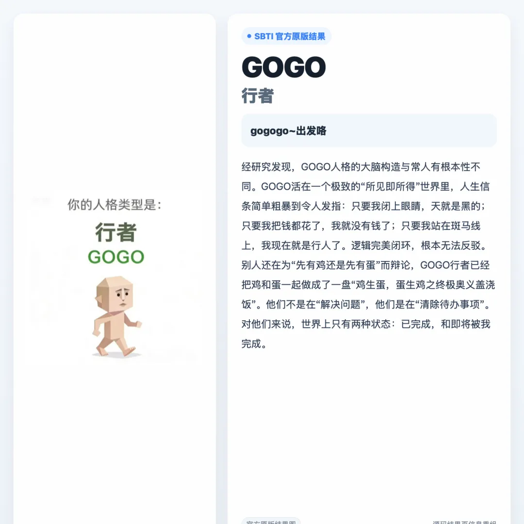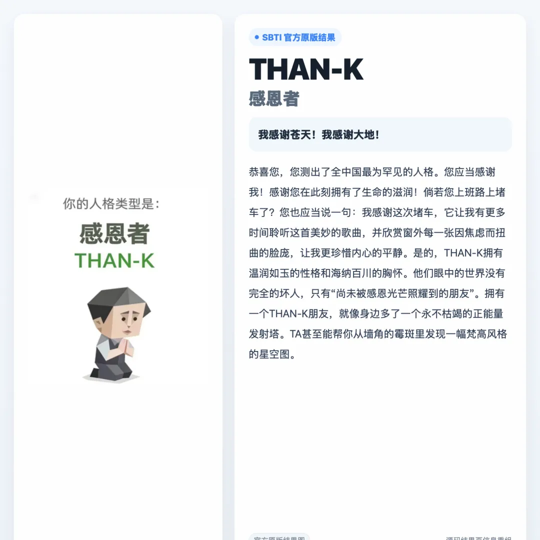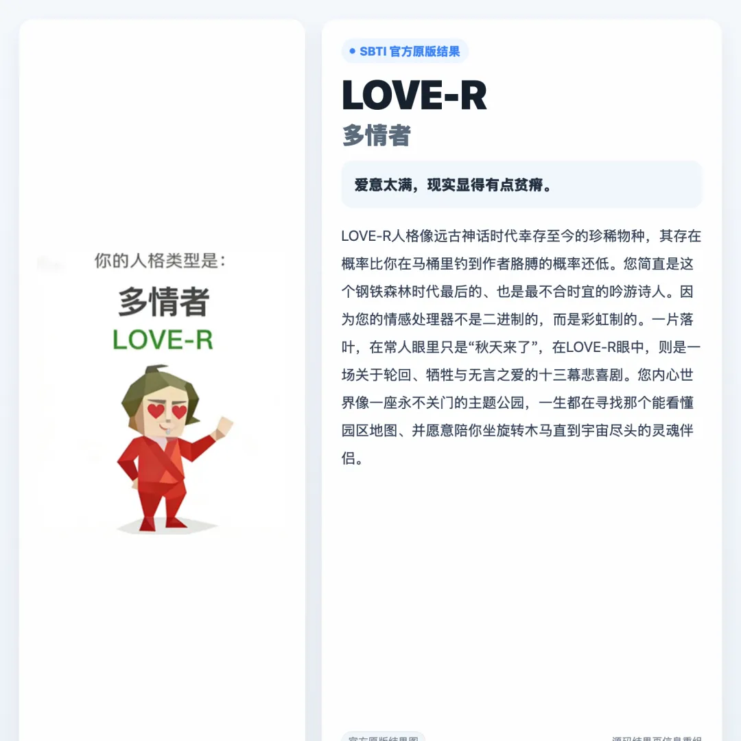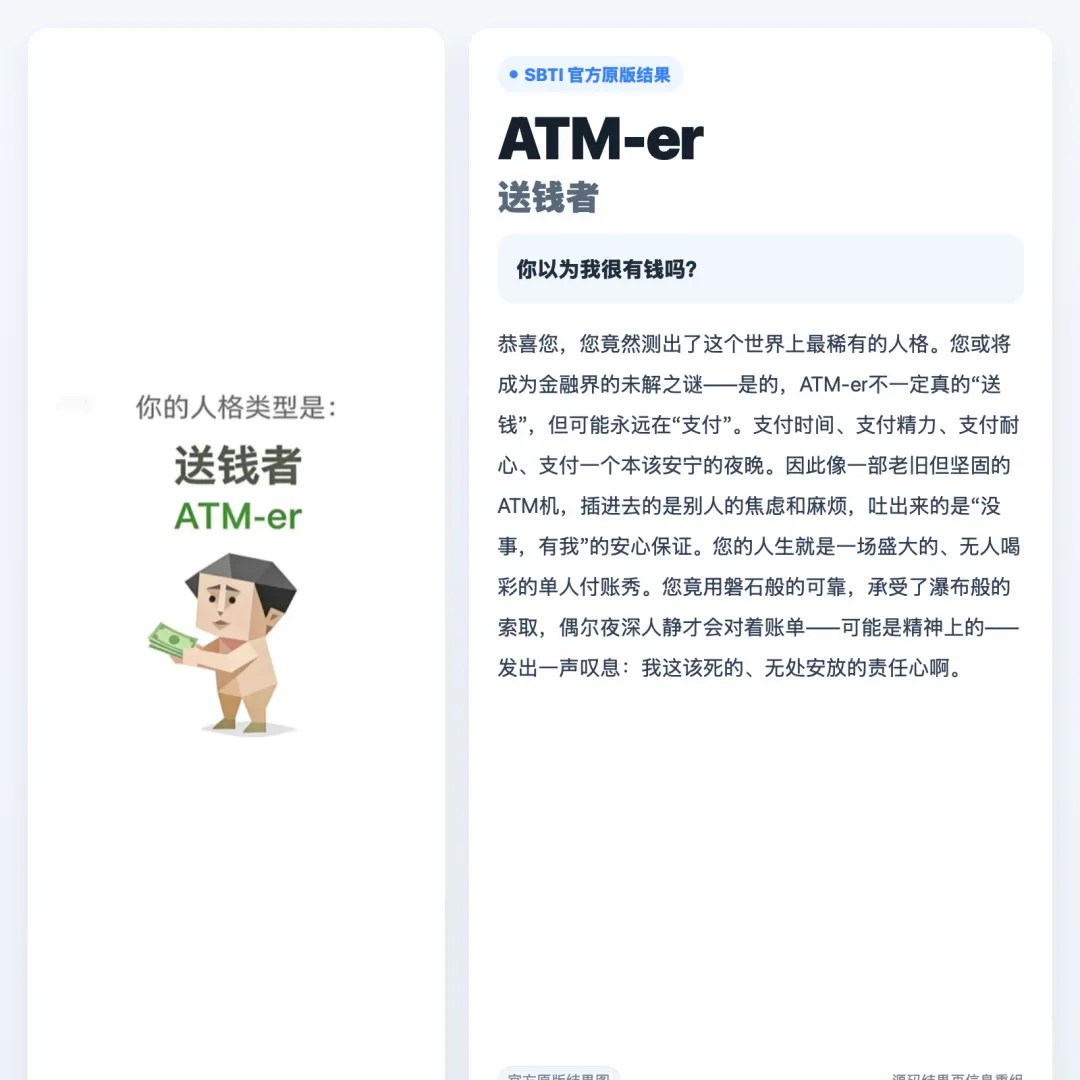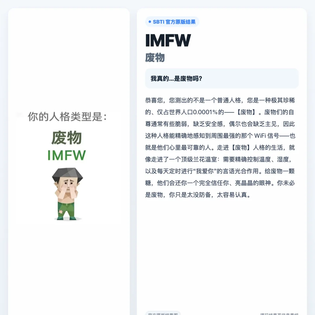 它能爆,是因为它从一开始就没打算做一个严肃的人格测试。 它真正做的,是把年轻人的疲惫、摆烂、内耗、嘴硬、自嘲和发疯,统统做成了一张适合截图发出去的结果页。
