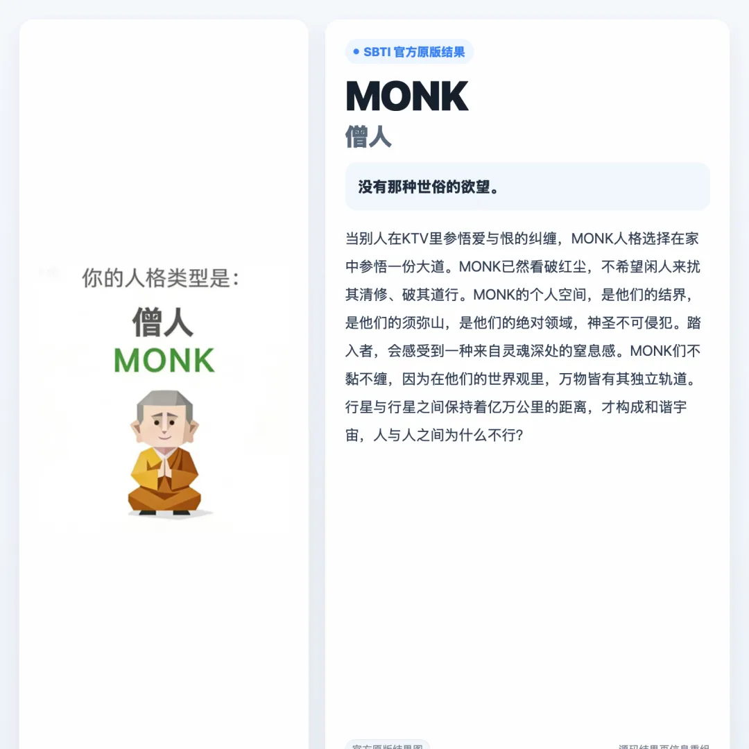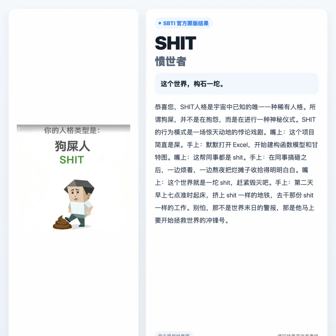 一个看上去像“抽象版 MBTI”的测试链接,在微信群、朋友圈和各个平台来回刷屏。有人测出自己是 SHIT,有人测出自己是 MONK,还有人一边笑一边把链接甩给朋友: