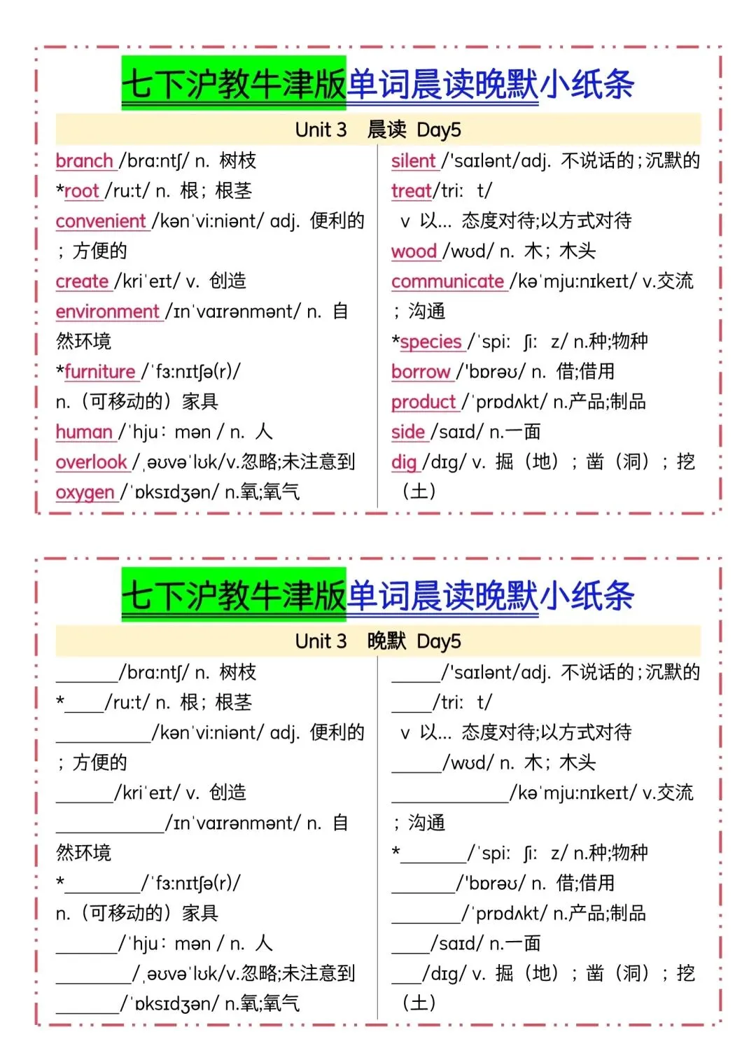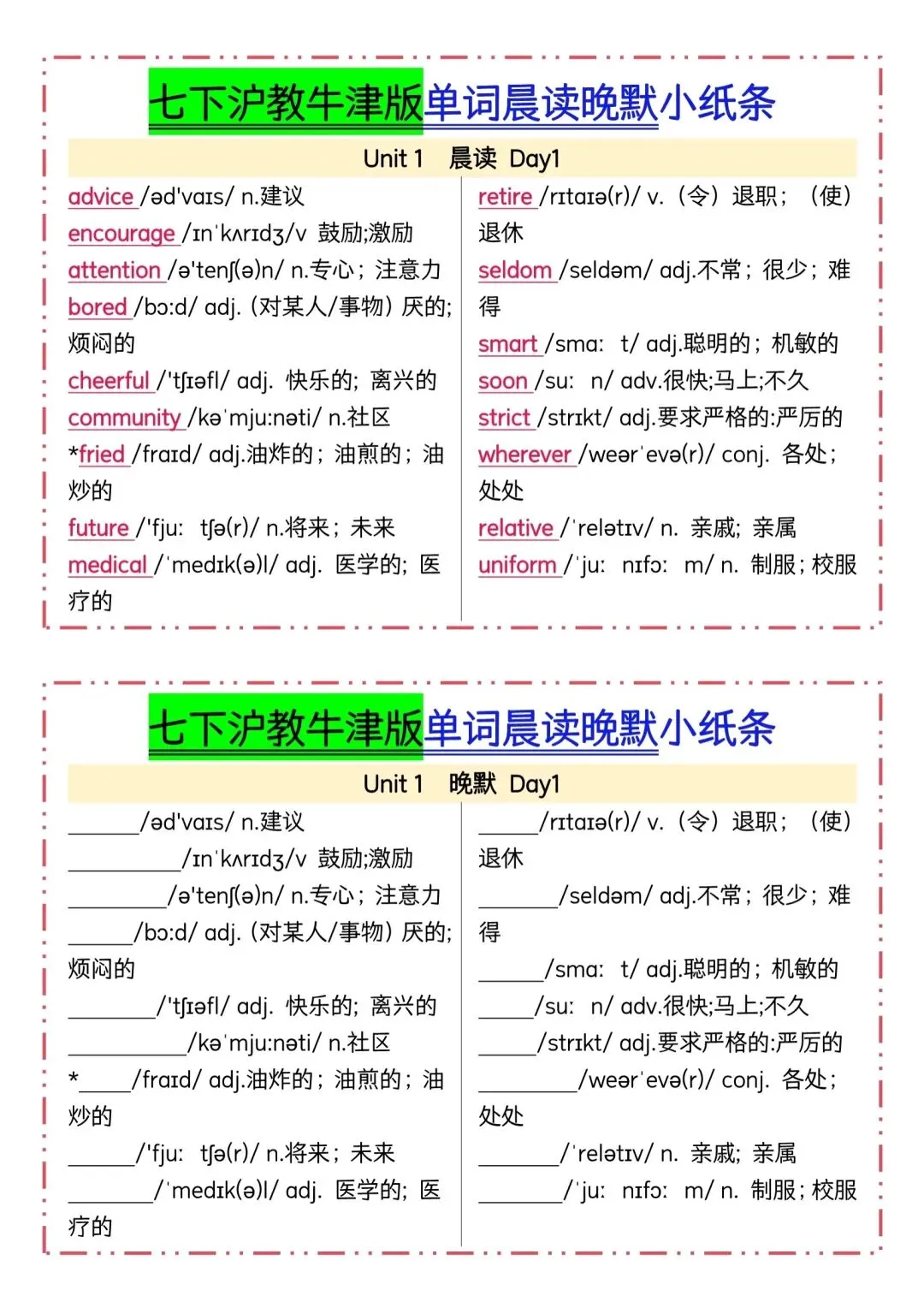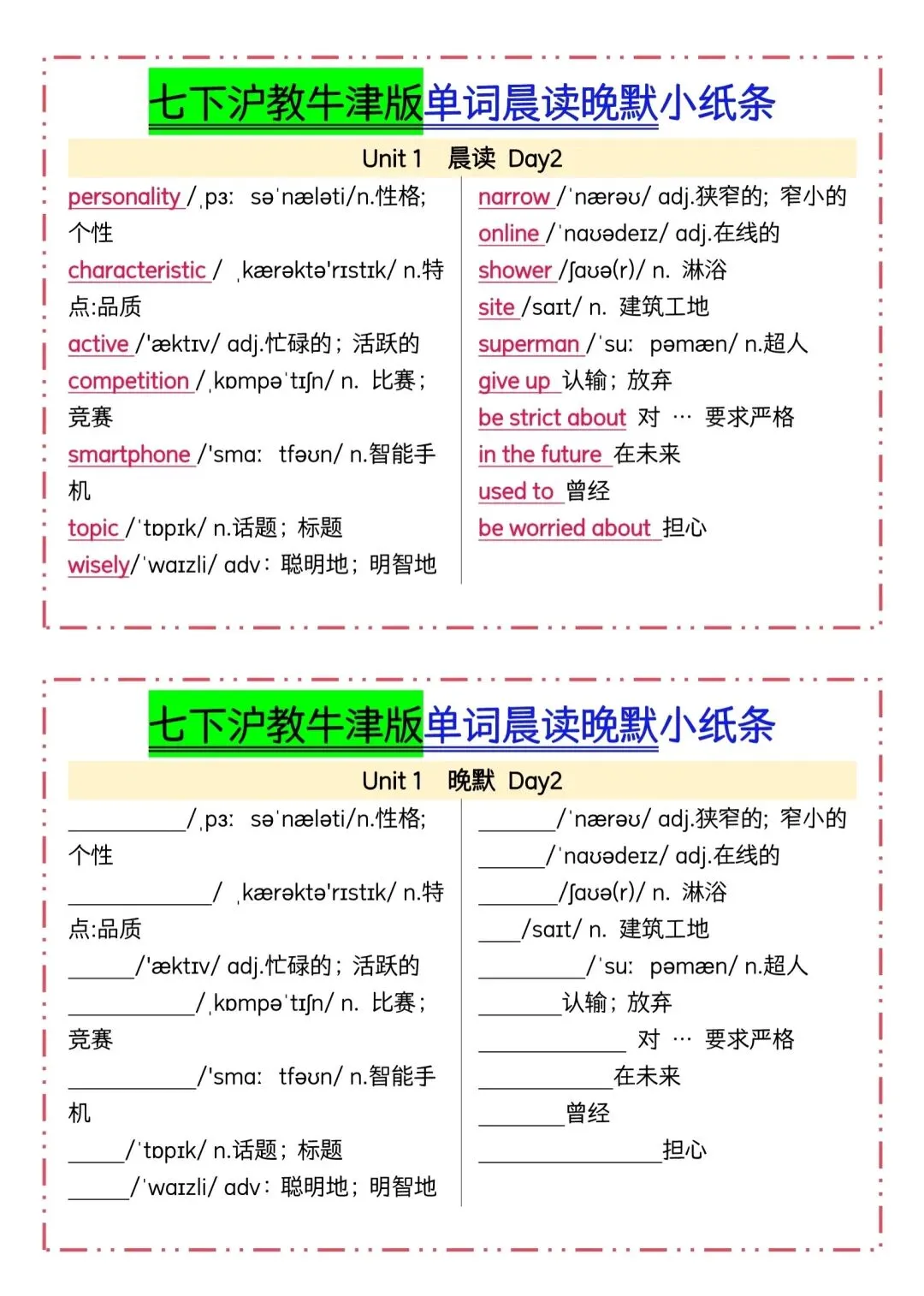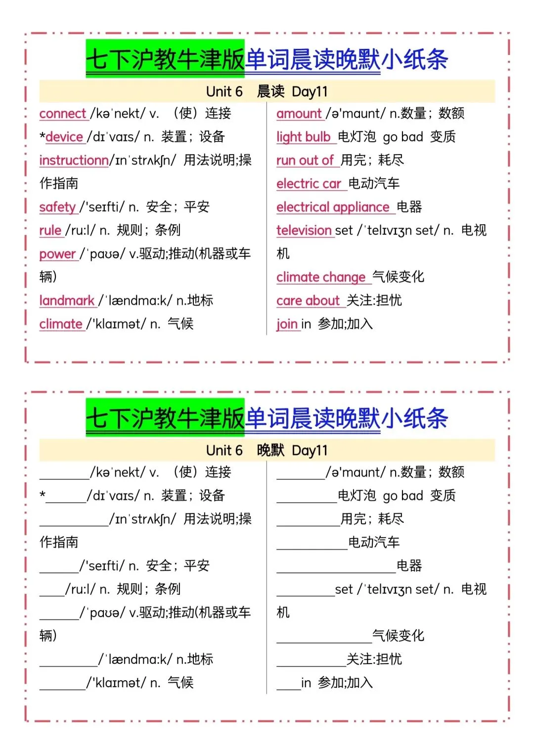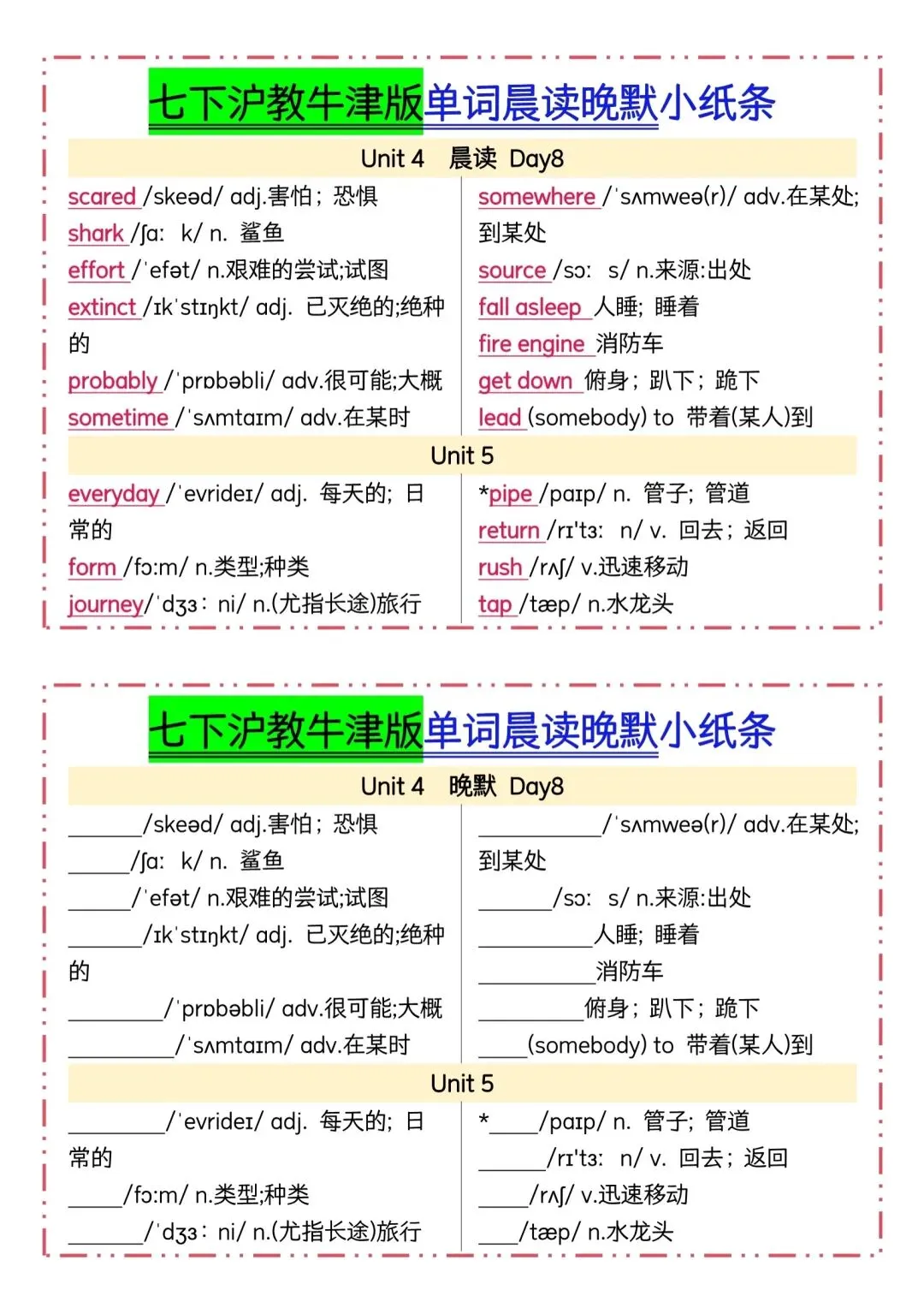 七下英语沪教牛津版单词晨读晚默小纸条(可下载打印) 资源下载见图片底部 资源介绍 电子版PDF文档 网盘下载链接详见页面底部 ▼内容预览▼ 版面所限,此处仅展示部分内容 完整版电子版👇 获取完整电子版方式 👇 点击下方卡片关注 进入“瑶瑶妈妈爱学习”的后台 发送消息 资料下载 获取打印电子版方式 重要说明 版权声明: 本公众号分享的资源,所有文件版权归原作者所有,如有侵权可以联系本人删除。本公众号尊重版权,有任何版权问题,可以直接在公众号留言,我看到后会回复。