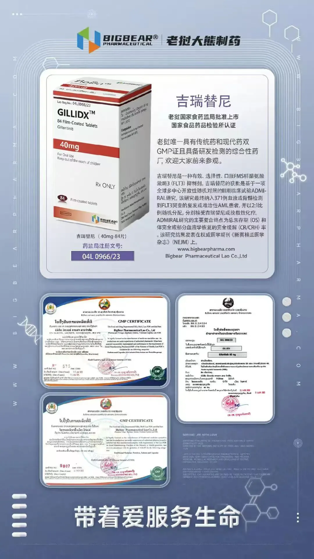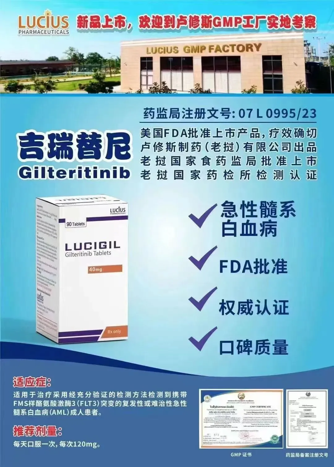 适应证:吉瑞替尼通过抑制FLT3及AXL酪氨酸激酶活性,阻断白血病细胞的增殖与生存信号,从而诱导肿瘤细胞凋亡,发挥抗白血病作用。用于治疗采用经充分验证的检测方法检测到携带FMS样酪氨酸激酶3突变的复发性或难治性急性髓系白血病成人患者。