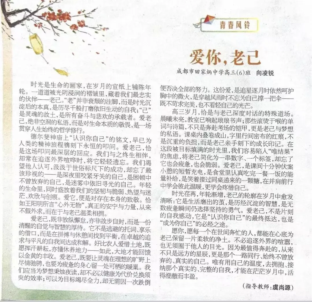 26届德阳二诊试题word版,含听力答案 试卷链接:我用夸克网盘分享了「2026届四川德阳市高三第二次诊断英语试题.zip」,点击链接即可保存。链接:https://pan.quark.cn/s/c745dcc11000。题不简单,阅读选主旨感觉很难选出非常符合的,择优录取吧(个人观点),完型紧跟时事爱你老几。语法填空个人感觉不难,可是学生答题情况不好,也算是帮助学生暴露问题了。应用文是理解观点,平时几乎没练习。 完形填空是爱你老几(之前分享过一本情绪的书,词汇不是很难,挺有趣的,(爱老几)好书分享——My mixed emotions)。爱你老几,出现在了完形填空里面,果然英语不止学习语言知识,更关于传递正能量。 下图是招生考试报上别人家的优秀学生写的爱你老几,不得不点个赞,以网络热梗切入,发掘背后的育人价值。一直不是很懂突然火起来的网络热梗,可是这个学生让我意识到热梗背后说不定也有其价值。 Dream high among the stars, but walk firmly on earth.仰望星空,脚踏实地。