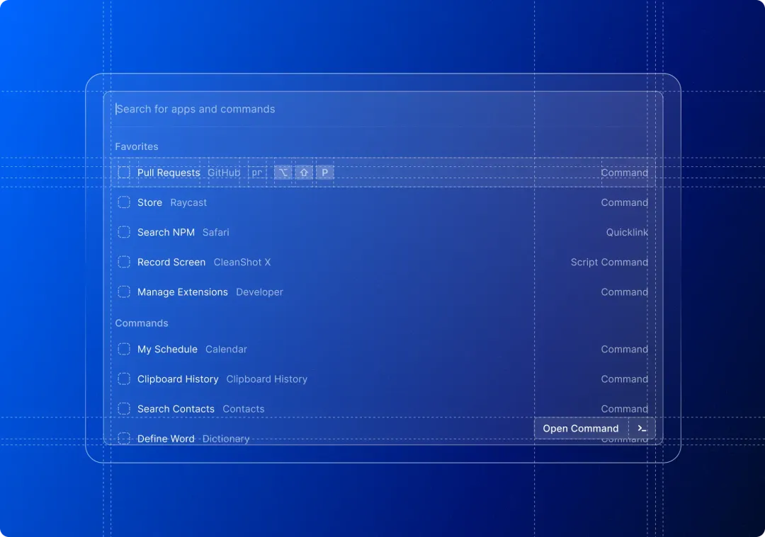• 剪贴板历史 — 随时找回复制过的内容 • Snippet — 快捷文字片段,输入关键字自动补全 • 计算器 — 直接出结果,不用开 App • 扩展生态 — 数千款扩展,GitHub、AI、日历、窗口管理…