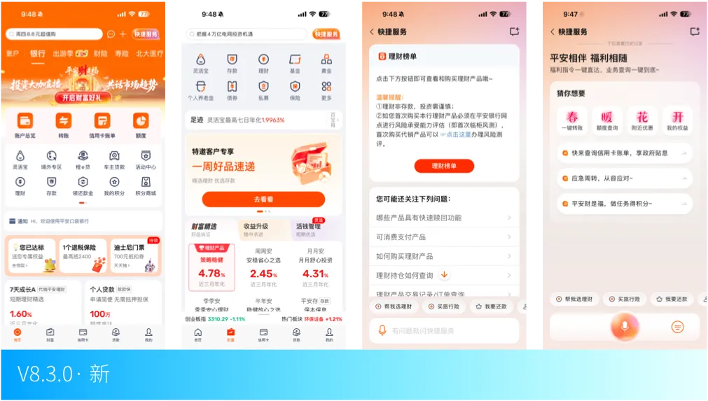 平安银行8.3是本月最具战略分量的更新。这次迭代的核心逻辑是以 AI 助手为支点,对整个 APP 的信息架构进行重组,将原本分散的功能模块(金融、医疗、保险)整合至对话式服务入口之下,完成了从“功能菜单型银行 APP ”向“智能助理型金融平台”的角色跃迁。