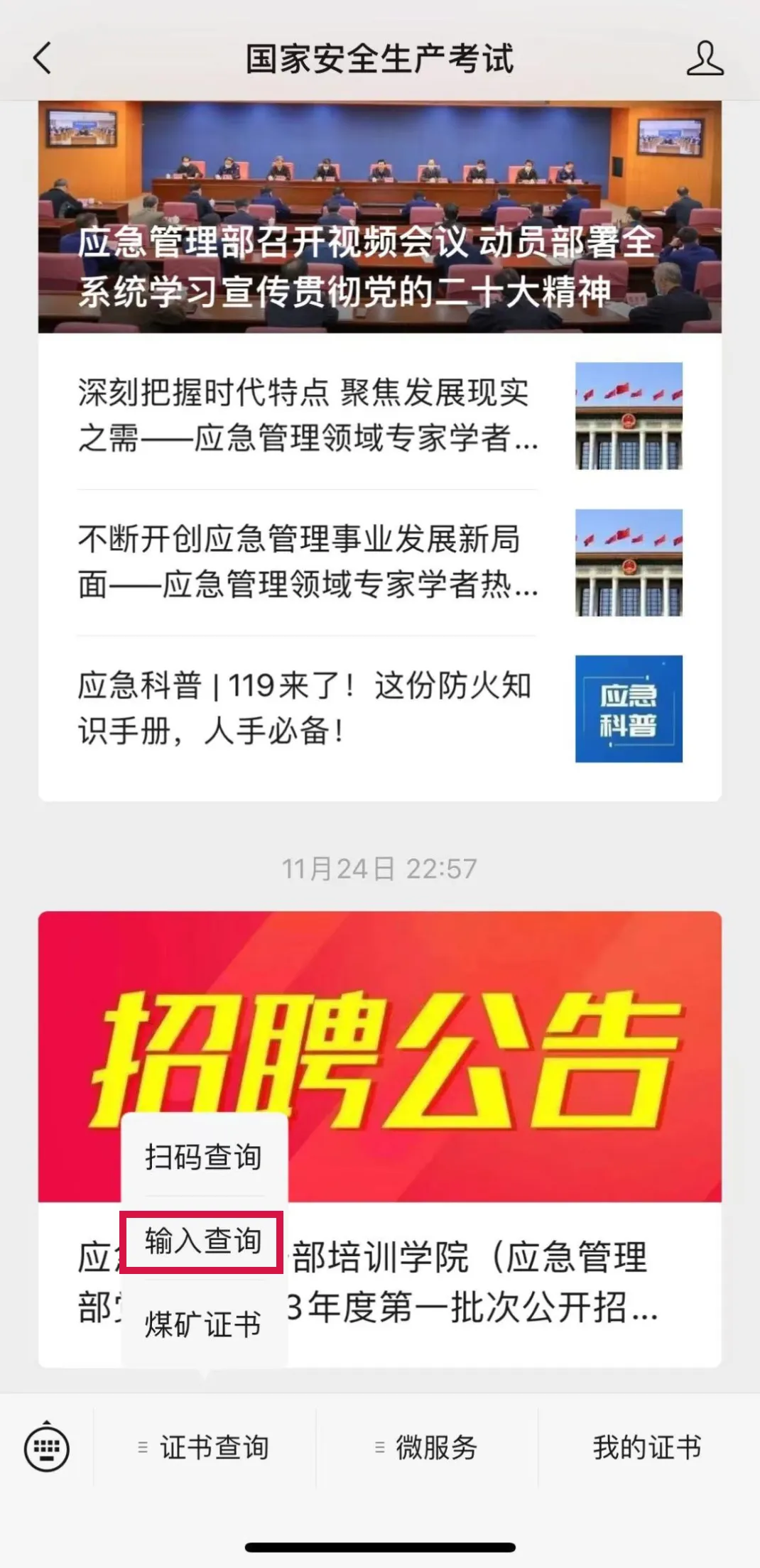 通过“输入查询(或扫码查询)”查询证书信息;进入公众号,点击屏幕左下方“证书查询”,出现弹框之再点击“输入查询”;