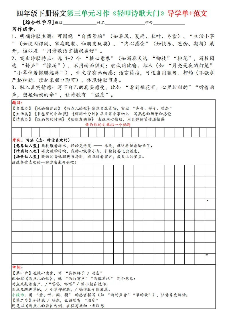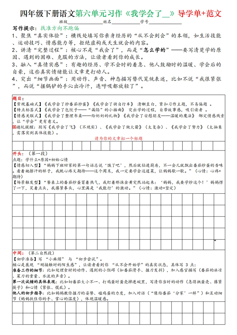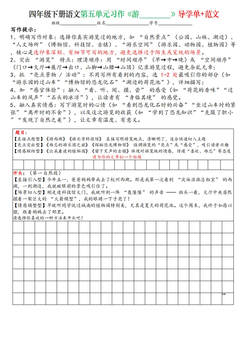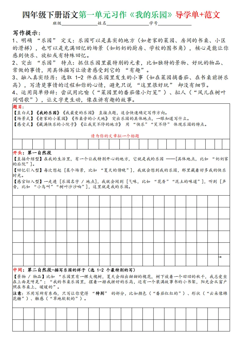 🌸今天给家长分享的是:26四年级下册语文《作文导学单》|电子版可打印