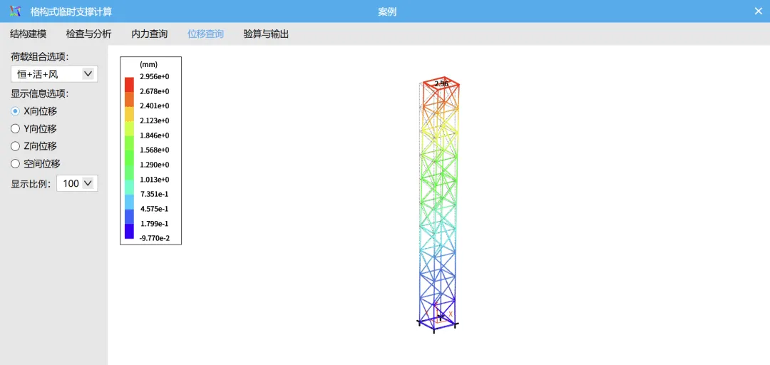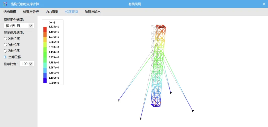 ◆ 有限元整体分析:对格构柱、缆风绳进行整体建模计算,内力、位移及各项验算结果图形化直观展示,便于快速校核、调整与优化;