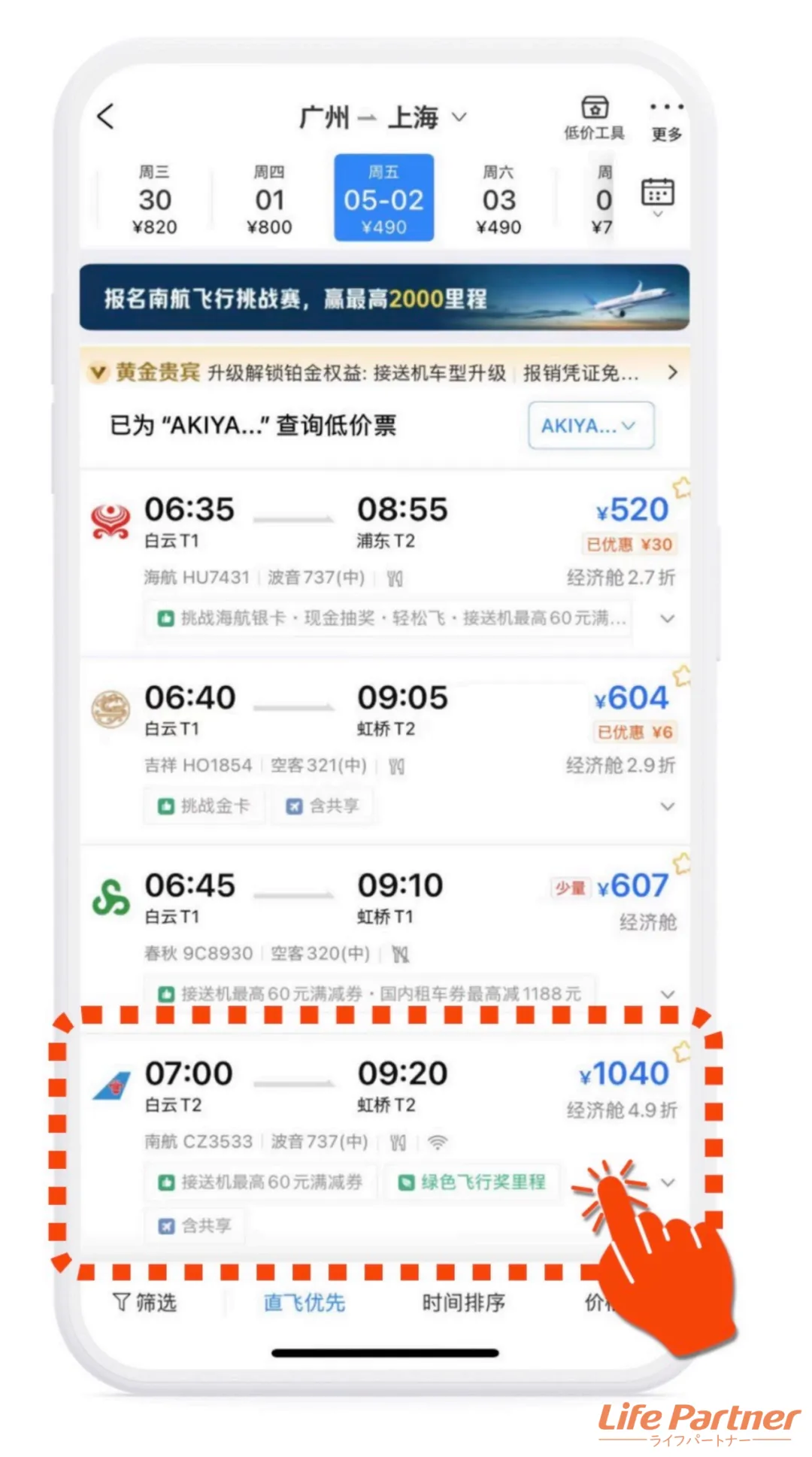 次にフライトを選びます
